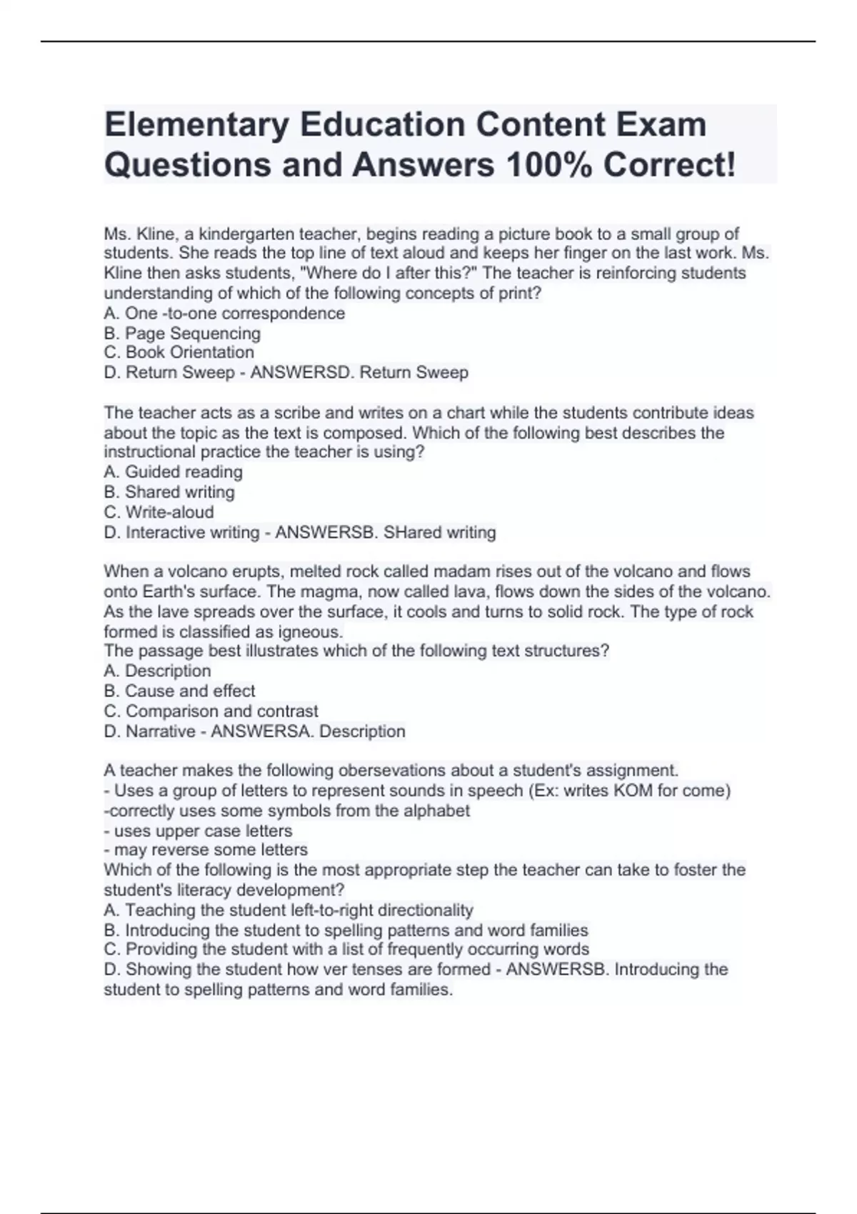 Elementary Education Content Exam Questions and Answers 100% Correct!Ms. Kline, a kindergarten teacher, begins reading a picture book to a small group of students. She reads the top line of text aloud and keeps her finger on the last work. Ms. Kline then asks students, "Where do I after this?" The teacher is reinforcing students understanding of which of the following concepts of print? A. One -to-one correspondence B. Page Sequencing C. Book Orientation D. Return Sweep - ANSWERSD. Return Sweep The teacher acts as a scribe and writes on a chart while the students contribute ideas about the topic as the text is composed. Which of the following best describes the instructional practice the teacher is using? A. Guided reading B. Shared writing C. Write-aloud D. Interactive writing - ANSWERSB. SHared writing When a volcano erupts, melted rock called madam rises out of the volcano and flows onto Earth's surface. The magma, now called lava, flows down the sides of the volcano. As the lave spreads over the surface, it cools and turns to solid rock. The type of rock formed is classified as igneous. The passage best illustrates which of the following text structures? A. Description B. Cause and effect C. Comparison and contrast D. Narrative - ANSWERSA. Description A teacher makes the following obersevations about a student's assignment. - Uses a group of letters to represent sounds in speech (Ex: writes KOM for come) -correctly uses some symbols from the alphabet - uses upper case letters - may reverse some letters Which of the following is the most appropriate step the teacher can take to foster the student's literacy development? A. Teaching the student left-to-right directionality B. Introducing the student to spelling patterns and word families C. Providing the student with a list of frequently occurring words D. Showing the student how ver tenses are formed - ANSWERSB. Introducing the student to spelling patterns and word families.