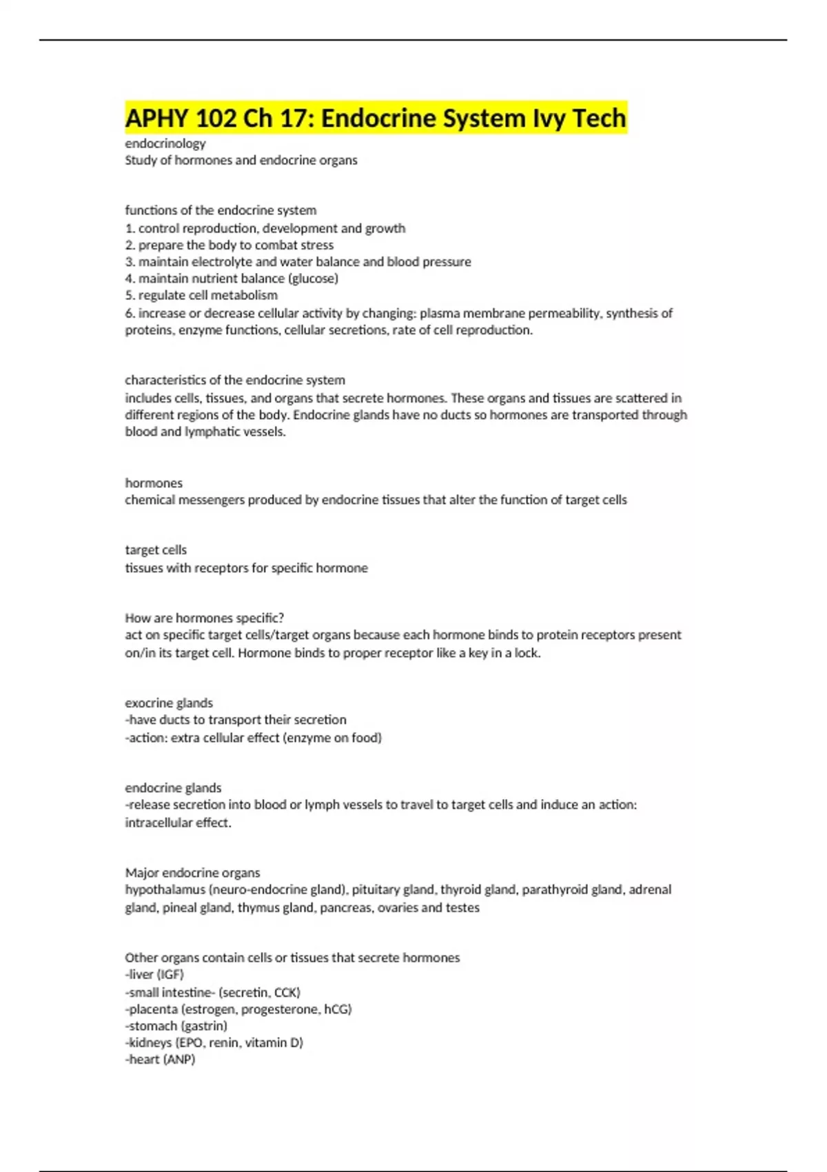 APHY 102 Ch 17: Endocrine System Ivy Tech