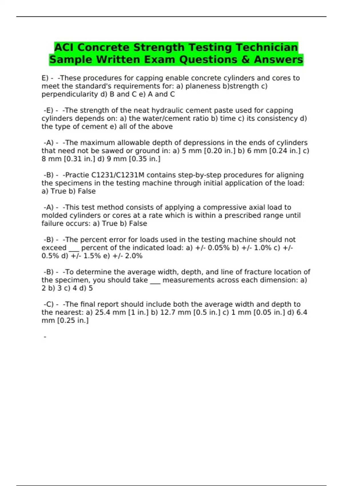 ACI Concrete Strength Testing Technician Sample Written Exam Questions & Answers