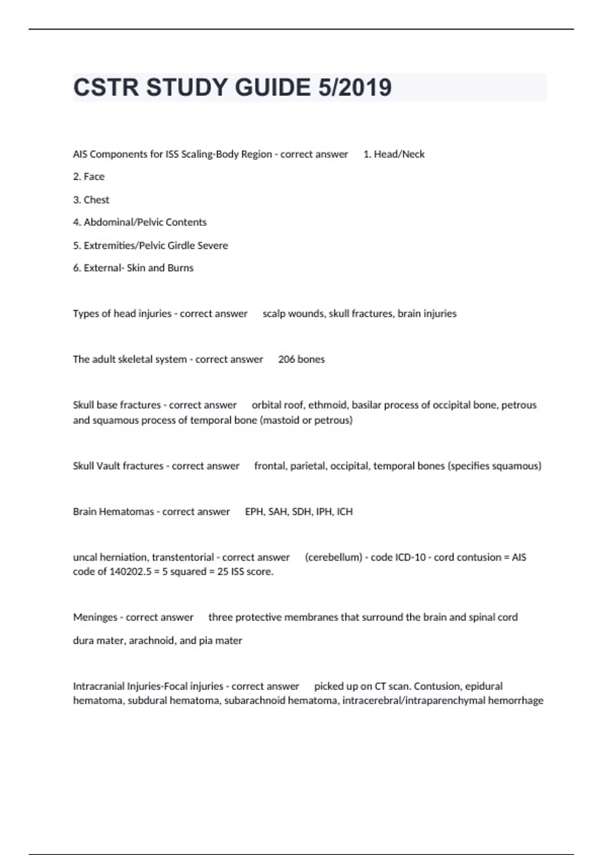 AIS Components for ISS Scaling-Body Region - correct answer 1. Head/Neck 2. Face 3. Chest 4. Abdominal/Pelvic Contents 5. Extremities/Pelvic Girdle Severe 6. External- Skin and Burns Types of head injuries - correct answer scalp wounds, skull fractures, brain injuries The adult skeletal system - correct answer 206 bones Skull base fractures - correct answer orbital roof, ethmoid, basilar process of occipital bone, petrous and squamous process of temporal bone (mastoid or petrous) Skull Vault fractures - correct answer frontal, parietal, occipital, temporal bones (specifies squamous) Brain Hematomas - correct answer EPH, SAH, SDH, IPH, ICH uncal herniation, transtentorial - correct answer (cerebellum) - code ICD-10 - cord contusion = AIS code of 140202.5 = 5 squared = 25 ISS score. Meninges - correct answer three protective membranes that surround the brain and spinal cord dura mater, arachnoid, and pia mater Intracranial Injuries-Focal injuries - correct answer picked up on CT scan. Contusion, epidural hematoma, subdural hematoma, subarachnoid hematoma, intracerebral/intraparenchymal hemorrhage Intracranial Injuries-Nonfocal Head Injuries - correct answer concussions, shear injury, diffuse axonal injury (DAI), anoxic brain injury (ABI) - these go down to the cellular level. Cranial Nerves and Functions - correct answer I. Olfactory- smell II. Optic - Vision III. oculomotor - Pupil, some extraocular movement IV. Troclear - extraocular movements V. Trigeminal - some movements of the jaw, sensation VI. Abducens- lateral extraocular movement VII. Facial - facial muscle movement, taste VIII. Acoustic- hearing, balance IX. Glossopharyngeal - pharynx-motor, ear/pharynx, tongue- movement X. Vagus - palate, larynx, pharynx, involuntary muscles XI. Accessory - sternocleidomastoid/trapezius muscles XII. Hypoglossal - tongue Facial Bones - correct answer • Orbits • Nasal bones • Maxillae • Mandible • Palatine • Vomer Facial Mechanisms of Injury - correct answer deep lacerations, deformity, difficulty speaking, visual changes, entrapment of muscles, rhinorrhea, otorrhea, trismus LeFort Fractures - correct answer Type I: maxilla dissociated from skull base - nasal aperture; "floating palate" Type II: central midface dissociation - inferior orbital rim, orbital floor; "pyramidal" Type III: complete midface dissociation - lateral orbital wall, zygomatic arch; "floating face" Other types of Facial Injuries - correct answer injuries to the nose, mandible, maxilla, eyes, ears Facial Diagnostics and Procedures - correct answer CT scan, MRI scan, X rays, ORIF, Enucleation or removal of the eyeball. Neck Structures - correct answer • Pharynx • Larynx • Epiglottis • Thyroid Cartilage • Cricoid Cartilage • Trachea • Esophagus • Vertebrae • Carotid Arteries: common, internal,external • Vertebral artery • Jugular vein • Vagus Nerve • Phrenic Nerve Neck Injury Indicators - correct answer • Bleeding • Stridor • Difficulty Breathing • Bruising to the Neck • Deviated Trachea • Subcutaneous emphysema • Zones of the Neck: 1. Angle of the mandible to base of the skull 2. Cricothyroid Cartilage Neck Trauma procedures - correct answer • Cricothyroidotomy - needle through a catheter • Tracheostomy - done when a patient is stabilized • Neck Exploration • Intubation Vertebral Column Dislocation - correct answer • Ligamentous injuries - ligaments' purpose is to keep spine aligned. • Dislocations - unilateral facet, bilateral facet • Subluxation- partial dislocation Vertebral Column Fractures - • Simple • % compression or wedge • Comminuted or burst - broken into pieces • Tear drop Spinal Cord Injuries - • Concussion - numbness and tingling • Contusion- bruising • Transection • Interruption in vascular supply • SCIWORA - spinal cord injury with radiological arteries Spinal Cord Descriptors - correct answer • Neurodeficits • Paresis- inability to move • Quadriplegia, tetraplegia - affects all parts • Paraplegia - affects lower half of the body in terms of movement • Hemiplegia - half of the body can't move Spinal Injury Diagnostics and Procedures - correct answer CT scan, MRI Procedures- cervical collar, tongs, halo traction, spinal decompression