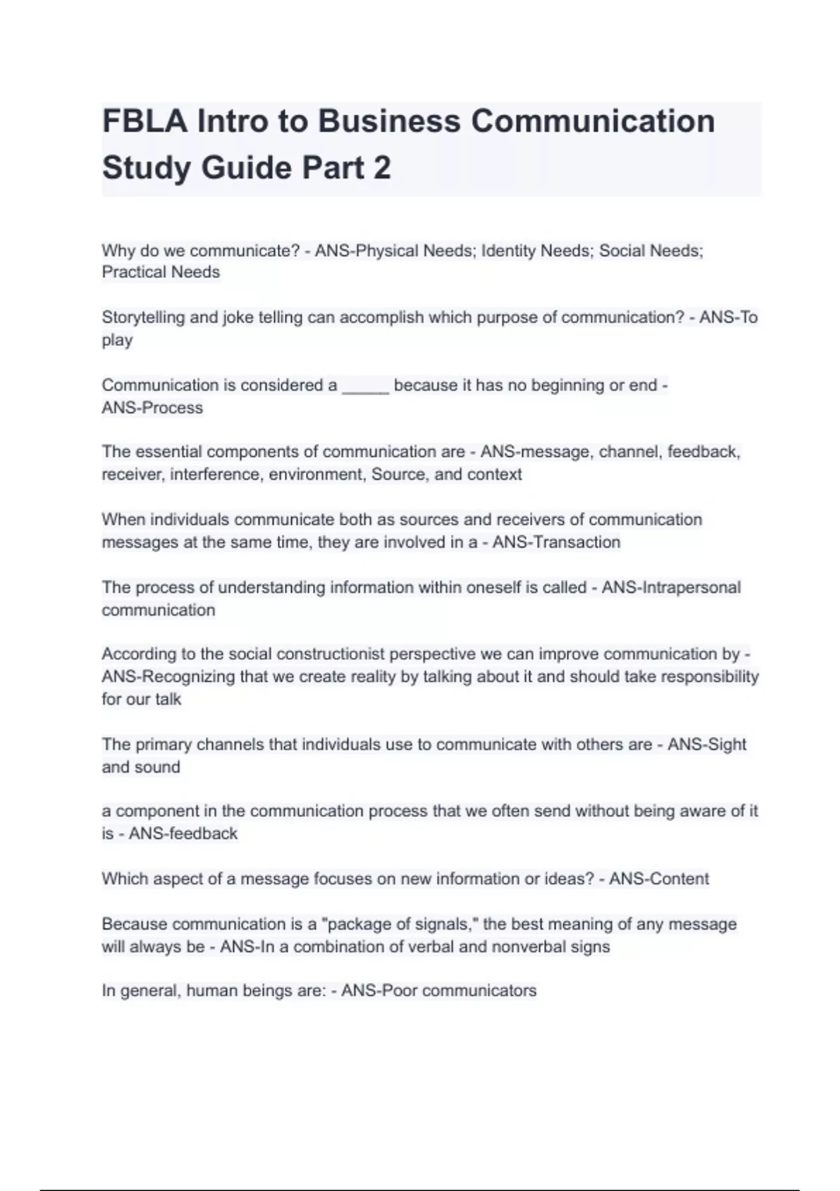 FBLA Intro to Business Communication Study Guide Part 2 with complete solution