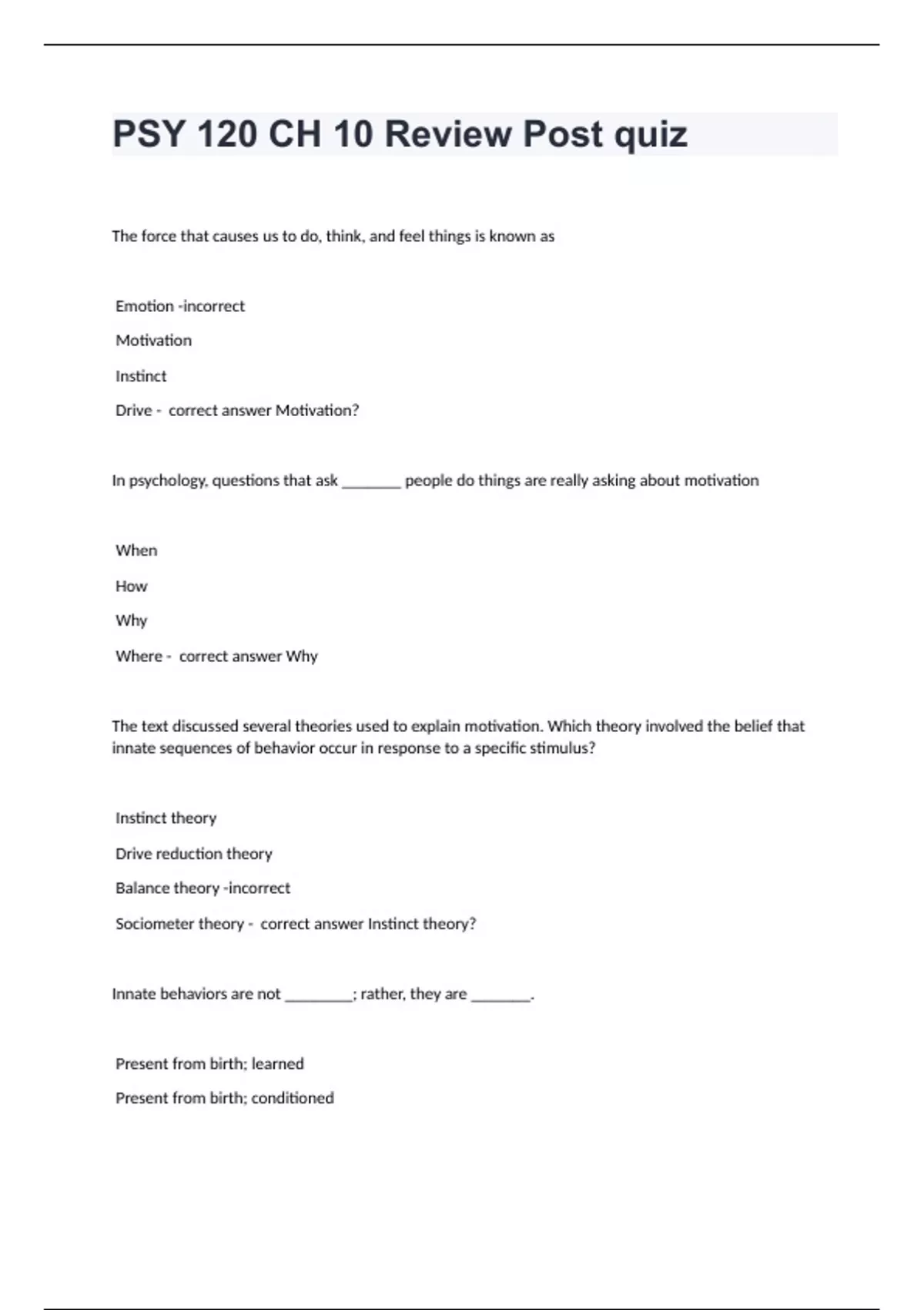 PSY 120 CH 10 Review Post quiz Question and answers 2024 verified to passPSY 120 CH 10 Review Post quiz The force that causes us to do, think, and feel things is known as Emotion -incorrect Motivation Instinct Drive - correct answer Motivation? In psychology, questions that ask _______ people do things are really asking about motivation When How Why Where - correct answer Why The text discussed several theories used to explain motivation. Which theory involved the belief that innate sequences of behavior occur in response to a specific stimulus? Instinct theory Drive reduction theory Balance theory -incorrect Sociometer theory - correct answer Instinct theory? Innate behaviors are not ________; rather, they are _______. Present from birth; learned Present from birth; conditi
