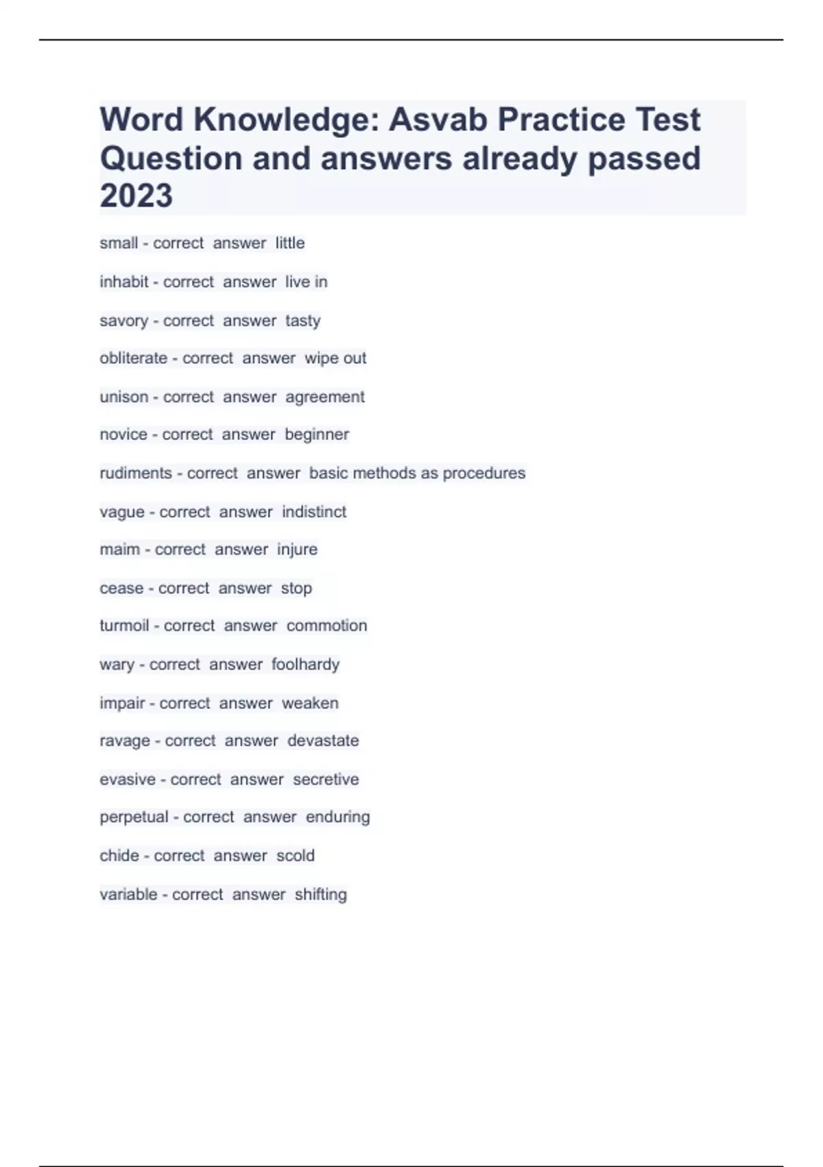 Word Knowledge: Asvab Practice Test Question and answers already passed 2023small - correct answer little inhabit - correct answer live in savory - correct answer tasty obliterate - correct answer wipe out unison - correct answer agreement novice - correct answer beginner rudiments - correct answer basic methods as procedures vague - correct answer indistinct maim - correct answer injure cease - correct answer stop turmoil - correct answer commotion wary - correct answer foolhardy impair - correct answer weaken ravage - correct answer devastate evasive - correct answer secretive perpetual - correct answer enduring chide - correct answer scold variable - correct answer shifting