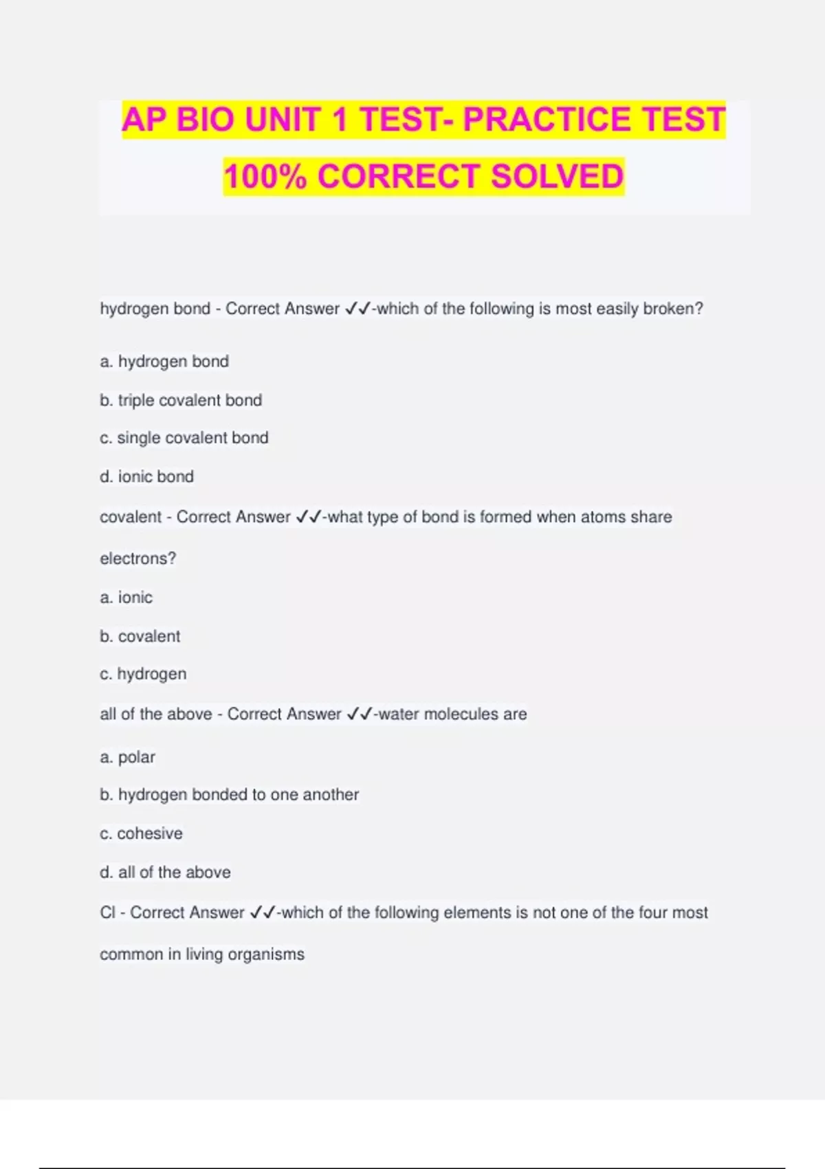 AP BIO UNIT 1 TEST- PRACTICE TEST 100% CORRECT SOLVED hydrogen bond - Correct Answer ️️ -which of the following is most easily broken? a. hydrogen bond b. triple covalent bond c. single covalent bond d. ionic bond covalent - Correct Answer ️️ -what type of bond is formed when atoms share electrons? a. ionic b. covalent c. hydrogen all of the above - Correct Answer ️️ -water molecules are a. polar b. hydrogen bonded to one another c. cohesive d. all of the above Cl - Correct Answer ️️ -which of the following elements is not one of the four most common in living organisms a. C b. N c. O d. Cl cohesion - Correct Answer ️️ -water's property of surface tension is due to a. cohesion b. adhesion c. high specific heat d. ionic bonding atoms together in molecules, molecules to other molecules - Correct Answer ️️ -ionic and covalent bonds attach ___ while hydrogen bonds attach ___ a. molecules to other molecules, atoms together in molecules b. water molecules to surfaces, water molecules to each other c. atoms together in molecules, molecules to other molecules d. water molecules to each other, water molecules to surfaces the pH goes above 7 - Correct Answer ️️ -what a solution becomes increasingly basic a. the pH goes down b. the number of H+ ions increases c. the pH remains the same d. the pH goes above 7 the number of electrons in the outermost energy level - Correct Answer ️️ -the number of bonds that an atom will make with other atoms is related to a. the number of electrons in the innermost shell number of neutrons in the nucleus c. the number of electrons in the outermost energy level d. the number of neutrons in the outermost energy level the pH of water to go down - Correct Answer ️️ -When HCl is dissolved in water, it makes H+ ions and Cl- ions. This causes _____. a. the pH of the water to go up. b. a pH reading of 15. c. the pH of the water to go down. d. a pH reading of 7. It is a universal solvent. - Correct Answer ️️ -Which of the following is not true about water? a. It dissolves other polar molecules. b. Drops cling together due to hydrogen bonding. c. It is a universal solvent. d. It is less dense as a solid than as a liquid. 100X more H+ - Correct Answer ️️ -A solution of pH 6 contains ____ than the same amount of solution of pH 8. a. 4X more H+ c. 100X less H+ b. 100X more H+ d. 2X more H+ Solvent...solute...acidic - Correct Answer ️️ -A can of soda consists mostly of sugar dissolved in water, with some carbon dioxide gas that makes it fizzy and makes the pH less than 7. In chemical terms you could say that soda is an aqueous solution, where water is the _____, sugar is an _____, and carbon dioxide makes the solution _____. a. Solvent ... solute ...basic b. Solute ... solvent ...basic c. Solvent...solute...acidic d. Solute ... solvent ...acidic Donates H+ when conditions become too basic and accepts H+ ions when conditions become too acidic. - Correct Answer ️️ -A buffer maintains a stable pH by: a. Providing an acid to control overly basic conditions in the body b. Donates OH- ions when conditions become too acidic and accepts OH- ions when conditions become too basic c. Donates H+ when conditions become too basic and accepts H+ ions when conditions become too acidic. d. Providing a base to control overly acidic conditions in the body. Nitrogen oxides ... sulfur oxides - Correct Answer ️️ -The emission of _____ and _____ are primarily responsible for acid precipitation. a. Carbon dioxide ... methane b. CFC's ... sulfur oxides c. Nitrogen oxides ... sulfur oxides d. Carbon dioxide ... ozone all of the above - Correct Answer ️️ -Hydrogen bonding ___________. a. causes water molecules to cling to each other b. allows water to absorb a lot of heat without a huge change in temperature c. must be broken to convert water to steam d. all of the above It is less dense as a solid than as a liquid. - Correct Answer ️️ -Aquatic living things are able to survive the winter thanks to which property of water?