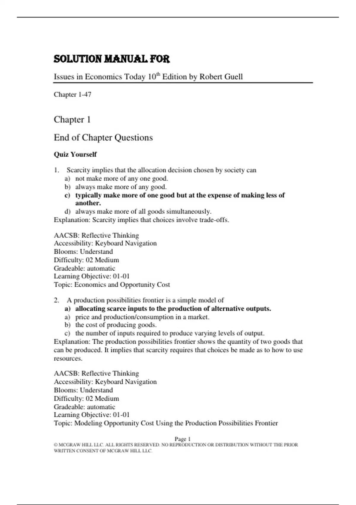 Solution Manual for Issues in Economics Today 10th Edition by Robert Guell. Chapter 1: Economics: The Study of Opportunity Cost Chapter 2: Supply and Demand Chapter 3: The Concept of Elasticity and Consumer and Producer Surplus Chapter 4: Firm Production, Cost, and Revenue Chapter 5: Perfect Competition, Monopoly, and Economic versus Normal Profit Chapter 6: Every Macroeconomic Word You Ever Heard: Gross Domestic Product, Inflation, Unemployment, Recession, and Depression Chapter 7: Money, Interest Rates, and Present Value Chapter 8: Aggregate Demand and Aggregate Supply Chapter 9: Fiscal Policy Chapter 10: Monetary Policy Chapter 11: Federal Spending Chapter 12: Federal Deficits, Surpluses, and the National Debt Chapter 13: The Great Recession Chapter 14: The COVID-19 Recession Chapter 15: Is Economic Stagnation the New Normal? Chapter 16: Is the (Fiscal) Sky Falling?: An Examination of Unfunded Social Security, Medicare, and State and Local Pension Liabilities Chapter 17: International Trade: Does It Jeopardize American Jobs Chapter 18: International Finance and Exchange Rates Chapter 19: The European Union, Debt Crisis, and Brexit Chapter 20: Economic Growth and Development Chapter 21: Are Trade Agreements Good for Us? Chapter 22: The Economics of Terrorism Chapter 23: The Line between Legal and Illegal Goods Chapter 24: Natural Resources, the Environment, and Climate Change Chapter 25: So You Want to Be a Lawyer: Economics and the Law Chapter 26: The Economics of Crime Chapter 27: Antitrust Chapter 28: Health Care Chapter 29: Government-Provided Health Insurance: Medicaid, Medicare, and the Children’s Health Insurance Program Chapter 30: The Economics of Prescription Drugs and Vaccines Chapter 31: The Economics of K–12 Education Chapter 32: College Education: Why Is It So Expensive? Chapter 33: The Economics of Sex, Race, and Ethnic Discrimination Chapter 34: Income and Wealth Inequality: What’s Fair? Chapter 35: Farm Policy Chapter 36: Minimum Wage Chapter 37: Rent Control Chapter 38: Poverty and Welfare Chapter 39: Head Start Chapter 40: Social Security Chapter 41: Personal Income Taxes Chapter 42: Energy Prices Chapter 43: If We Build It, Will They Come? And Other Sports Questions Chapter 44: The Stock Market and Crashes Chapter 45: Unions Chapter 46: The Economics of Big Retail: Walmart and Amazon Chapter 47: The Economic Impact of Casino and Sports Gambling
