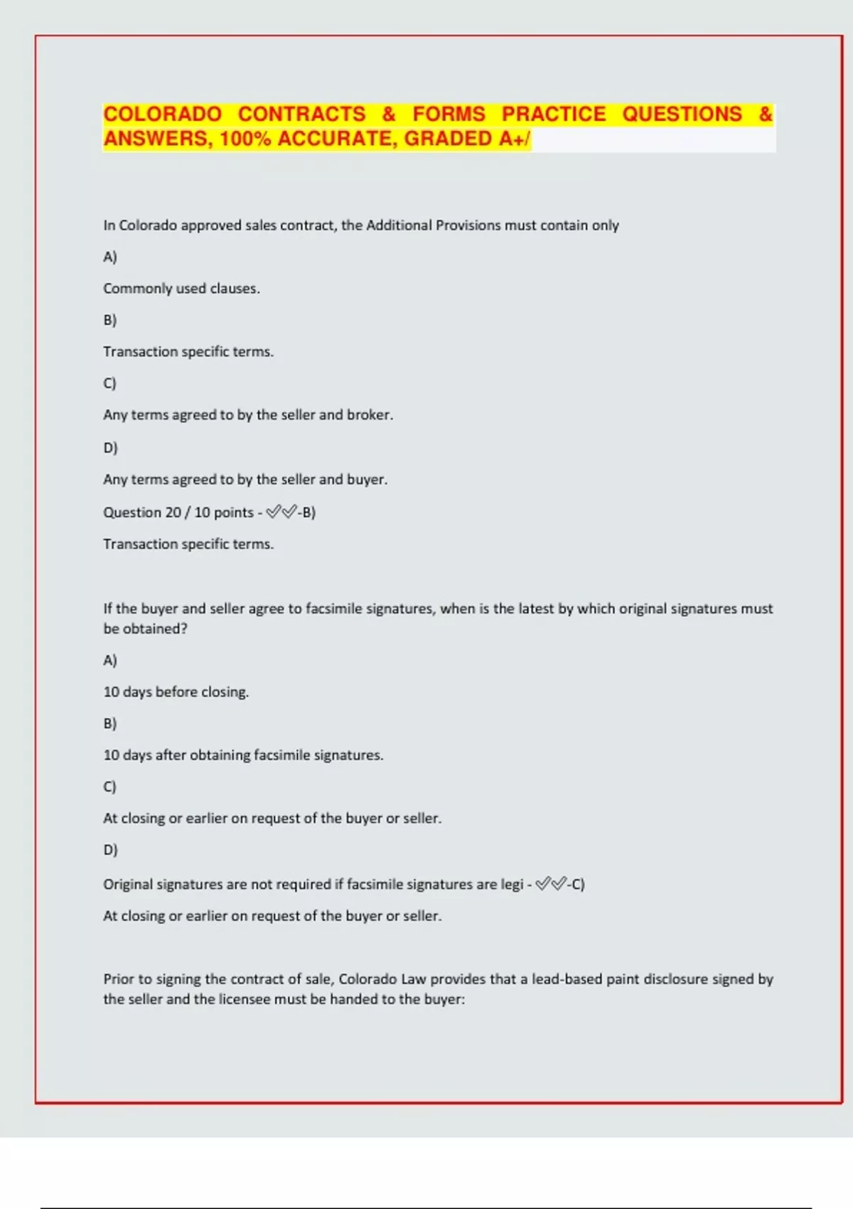 COLORADO CONTRACTS & FORMS PRACTICE QUESTIONS & ANSWERS, 100% ACCURATE, GRADED A+/ In Colorado approved sales contract, the Additional Provisions must contain only A) Commonly used clauses. B) Transaction specific terms. C) Any terms agreed to by the seller and broker. D) Any terms agreed to by the seller and buyer. Question 20 / 10 points - -B) Transaction specific terms. If the buyer and seller agree to facsimile signatures, when is the latest by which original signatures must be obtained? A) 10 days before closing. B) 10 days after obtaining facsimile signatures. C) At closing or earlier on request of the buyer or seller. D) Original signatures are not required if facsimile signatures are legi - -C) At closing or earlier on request of the buyer or seller. Prior to signing the contract of sale, Colorado Law provides that a lead-based paint disclosure signed by the seller and the licensee must be handed to the buyer: A) If the building was built prior to January, 1978. B) If a building permit was issued prior to January, 1978. C) If the property is intended for any residential use and a building permit was issued prior to January, 1978. D) If the property is intended for any residential use. Question 4 - -C) If the property is intended for any residential use and a building permit was issued prior to January, 1978. Under Colorado case law, a title company is permitted to offer closing services including legal document preparation as: A) A co-broker. B) An independent contractor. C) A scrivener of the broker. D) An agent of the seller. Question 5 - -C) A scrivener (notary) of the broker