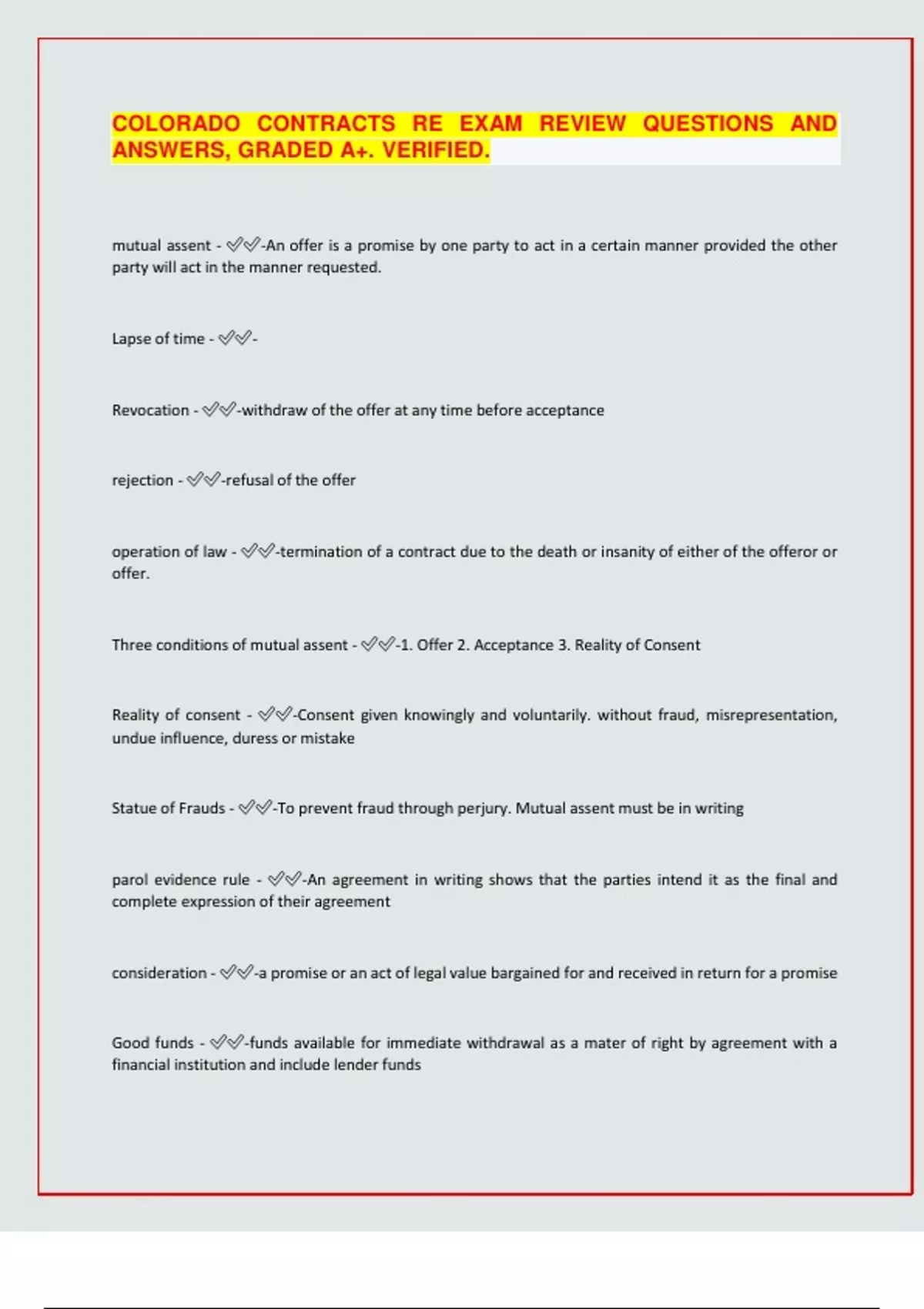 COLORADO CONTRACTS RE EXAM REVIEW QUESTIONS AND ANSWERS, GRADED A+. VERIFIED. mutual assent - -An offer is a promise by one party to act in a certain manner provided the other party will act in the manner requested. Lapse of time - - Revocation - -withdraw of the offer at any time before acceptance rejection - -refusal of the offer operation of law - -termination of a contract due to the death or insanity of either of the offeror or offer. Three conditions of mutual assent - -1. Offer 2. Acceptance 3. Reality of Consent Reality of consent - -Consent given knowingly and voluntarily. without fraud, misrepresentation, undue influence, duress or mistake Statue of Frauds - -To prevent fraud through perjury. Mutual assent must be in writing parol evidence rule - -An agreement in writing shows that the parties intend it as the final and complete expression of their agreement consideration - -a promise or an act of legal value bargained for and received in return for a promise Good funds - -funds available for immediate withdrawal as a mater of right by agreement with a financial institution and include lender funds estoppel certificate - -a statement from the lender regarding the exact loan balance and assumption terms, including changes to the interest rate etc. adjudicated water - -the judicial decree of the extent, nature and limitations of an appropriation in statutory court proceeding. The decree does not confer a right but confirms the right already taken appropriation - -the application of a certain portion of the waters of the State of Colorado to be of beneficial use appropriation date - -the date defining the priority of right to divert appropriated water in times of limited supply appropriator - -a person who applies water to beneficial use so as to obtain a water right augmentation - -a program to increase the supply of water available for beneficial use in a water basin by development of new or alternate means or points of diversion by pooling of water resources, by water exchange projects by providing substitute supplies of water, or by the development of new sources of water beneficial use - -the use of that amount of water that is reasonable and appropriate under reasonable, efficient practices to accomplish without waste, the purpose f