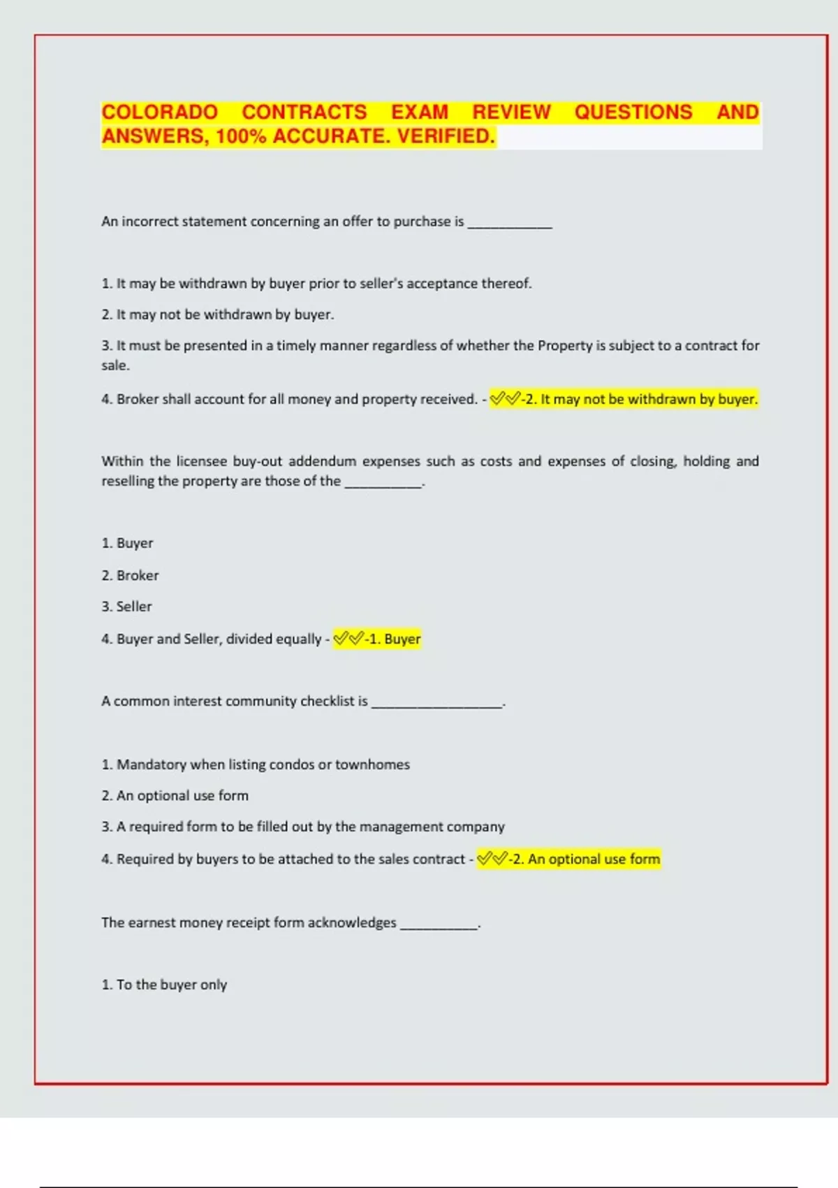 COLORADO CONTRACTS EXAM REVIEW QUESTIONS AND ANSWERS, 100% ACCURATE. VERIFIED. An incorrect statement concerning an offer to purchase is ___________ 1. It may be withdrawn by buyer prior to seller's acceptance thereof. 2. It may not be withdrawn by buyer. 3. It must be presented in a timely manner regardless of whether the Property is subject to a contract for sale. 4. Broker shall account for all money and property received. - -2. It may not be withdrawn by buyer. Within the licensee buy-out addendum expenses such as costs and expenses of closing, holding and reselling the property are those of the __________. 1. Buyer 2. Broker 3. Seller 4. Buyer and Seller, divided equally - -1. Buyer A common interest community checklist is _________________. 1. Mandatory when listing condos or townhomes 2. An optional use form 3. A required form to be filled out by the management company 4. Required by buyers to be attached to the sales contract - -2. An optional use form The earnest money receipt form acknowledges __________. 1. To the buyer only 2. To both the buyer and seller 3. To the seller only 4. To the broker and seller - -2. To both the buyer and seller A listing terminates upon expiration of the listing agreement, and ______________. 1. the broker has no further obligations even if the property is under contract 2. the broker must have the seller fill out and sign a new listing agreement 3. the broker is obligated to close the property even if the listing has expired 4. the brokerage firm may designate another broker to close the transaction - -3. the broker is obligated to close the property even if the listing has expired The Contract to Buy and Sell and disclosures 1. are typically all signed at closing 2. can be signed at closing 3. are signed at the time of the offer 4. must be signed by closing - -3. are signed at the time of the offer