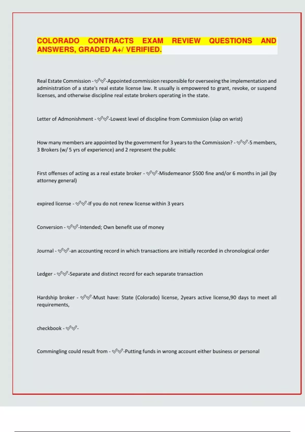 COLORADO CONTRACTS EXAM REVIEW QUESTIONS AND ANSWERS, GRADED A+/ VERIFIED. Real Estate Commission --Appointed commission responsible for overseeing the implementation and administration of a state's real estate license law. It usually is empowered to grant, revoke, or suspend licenses, and otherwise discipline real estate brokers operating in the state. Letter of Admonishment - -Lowest level of discipline from Commission (slap on wrist) How many members are appointed by the government for 3 years to the Commission? - -5 members, 3 Brokers (w/ 5 yrs of experience) and 2 represent the public First offenses of acting as a real estate broker - -Misdemeanor $500 fine and/or 6 months in jail (by attorney general) expired license - -If you do not renew license within 3 years Conversion - -Intended; Own benefit use of money Journal - -an accounting record in which transactions are initially recorded in chronological order Ledger - -Separate and distinct record for each separate transaction Hardship broker - -Must have: State (Colorado) license, 2years active license,90 days to meet all requirements, checkbook - - Commingling could result from - -Putting funds in wrong account