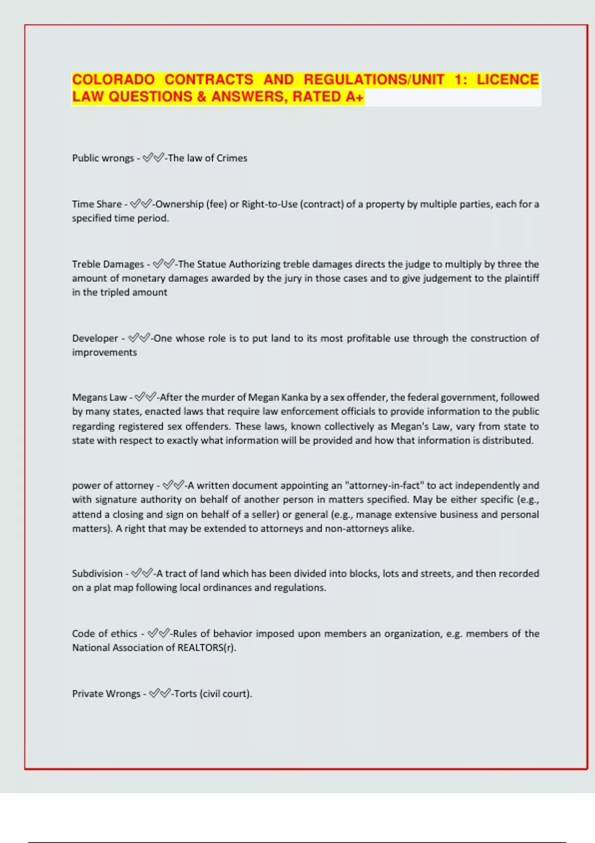 COLORADO CONTRACTS AND REGULATIONS/UNIT 1: LICENCE LAW QUESTIONS & ANSWERS, RATED A+| latest update 2024/25|
