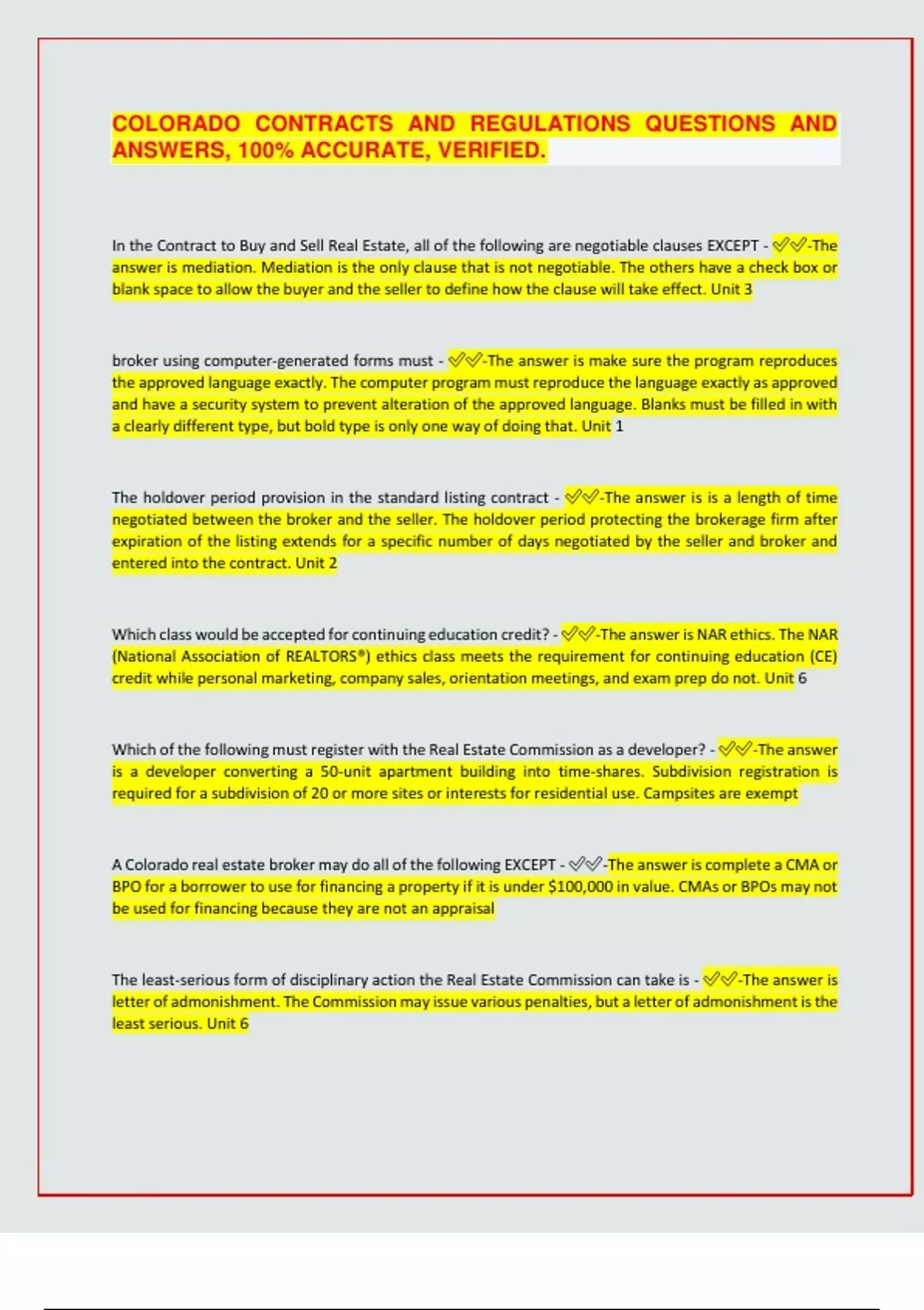 COLORADO CONTRACTS AND REGULATIONS QUESTIONS AND ANSWERS, 100% ACCURATE, VERIFIED. In the Contract to Buy and Sell Real Estate, all of the following are negotiable clauses EXCEPT - -The answer is mediation. Mediation is the only clause that is not negotiable. The others have a check box or blank space to allow the buyer and the seller to define how the clause will take effect. Unit 3 broker using computer-generated forms must - -The answer is make sure the program reproduces the approved language exactly. The computer program must reproduce the language exactly as approved and have a security system to prevent alteration of the approved language. Blanks must be filled in with a clearly different type, but bold type is only one way of doing that. Unit 1 The holdover period provision in the standard listing contract - -The answer is is a length of time negotiated between the broker and the seller. The holdover period protecting the brokerage firm after expiration of the listing extends for a specific number of days negotiated by the seller and broker and entered into the contract. Unit 2 Which class would be accepted for continuing education credit? - -The answer is NAR ethics. The NAR (National Association of REALTORS®) ethics class meets the requirement for continuing education (CE) credit while personal marketing, company sales, orientation meetings, and exam prep do not. Unit 6 Which of the following must register with the Real Estate Commission as a developer? - -The answer is a developer converting a 50-unit apartment building into time-shares. Subdivision registration is required for a subdivision of 20 or more sites or interests for residential use. Campsites are exempt A Colorado real estate broker may do all of the following EXCEPT - -The answer is complete a CMA or BPO for a borrower to use for financing a property if it is under $100,000 in value. CMAs or BPOs may not be used for financing because they are not an appraisal The least-serious form of disciplinary action the Real Estate Commission can take is - -The answer is letter of admonishment. The Commission may issue various penalties, but a letter of admonishment is the least serious. Unit 6 Colorado landlord may refuse to rent to - -The answer is Caucasian student. The Caucasian student could be excluded as a student if all students are excluded because occupation is not covered. Exclusion could not be based on race. A nonresident Colorado broker must do all of the following EXCEPT - -The answer is have an office in Colorado that is open to the public. The nonresident broker is not required to have an office in Colorado In a single-party listing, which of the following provisions or contingencies does NOT apply? - -The answer is holdover. Commission Position Statement CP-13 states that a single-party listing needs to be in the name of the specific buyer and should have the holdover clause removed. Unit 2 A lender calls the transaction-broker and tells him the buyer is unable to qualify for the loan requested in the contract. The broker should - -The answer is inform all the parties immediately because this is a material fact. The buyer's inability to qualify is a material fact and must be disclosed immediately, whether the licensee is the buyer's transaction-broker or agent. Unit 2 Which form is intended to help ensure fair and uniform tax assessments? - -The answer is Real Property Transfer Declaration (TD-1000). The TD-1000 Real Property Transfer Declaration is specifically designed to provide information to the county assessor to allow fair and uniform tax assessment based on the actual details of sales transactions. Unit 5 A broker employed by the listing brokerage, who is not the designated broker, wants to purchase one of the brokerage firm's listing. He should - -The answer is submit a Contract to Buy and Sell Real Estate. Commission Position Statement CP-23 explains the use of the Licensee Buy-Out Addendum. It is required only of the designated listing broker or the employing broker of the listing firm. No other licensee uses the addendum. The other broker would simply submit a Contract to Buy and Sell Real Estate. Unit 5 Three brokers are competing for a listing. The first broke