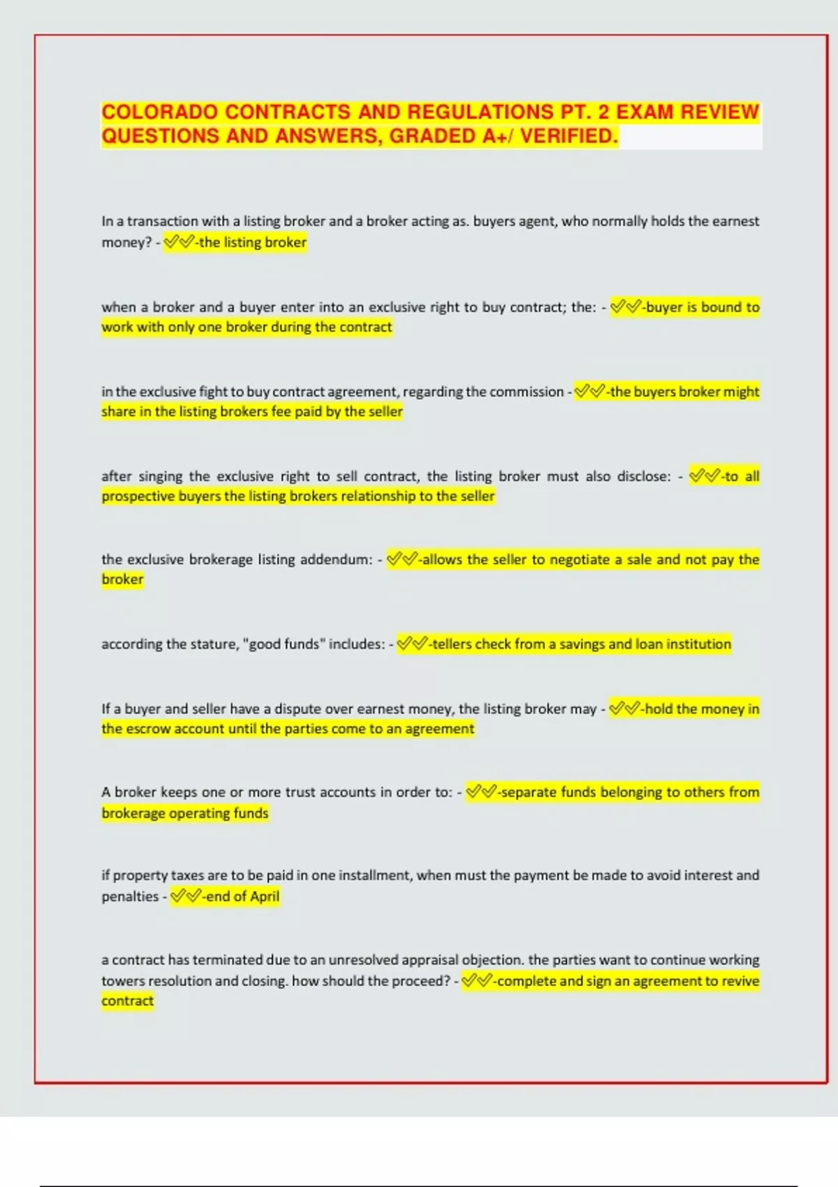 COLORADO CONTRACTS AND REGULATIONS PT. 2 EXAM REVIEW QUESTIONS AND ANSWERS, GRADED A+/ VERIFIED.| latest update 2024/25|