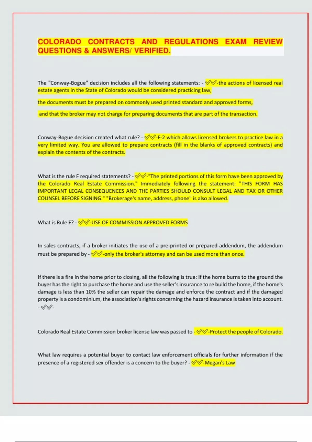COLORADO CONTRACTS AND REGULATIONS EXAM REVIEW QUESTIONS & ANSWERS/ VERIFIED. The "Conway-Bogue" decision includes all the following statements: - -the actions of licensed real estate agents in the State of Colorado would be considered practicing law, the documents must be prepared on commonly used printed standard and approved forms, and that the broker may not charge for preparing documents that are part of the transaction. Conway-Bogue decision created what rule? - -F-2 which allows licensed brokers to practice law in a very limited way. You are allowed to prepare contracts (fill in the blanks of approved contracts) and explain the contents of the contracts. What is the rule F required statements? - -"The printed portions of this form have been approved by the Colorado Real Estate Commission." Immediately following the statement: "THIS FORM HAS IMPORTANT LEGAL CONSEQUENCES AND THE PARTIES SHOULD CONSULT LEGAL AND TAX OR OTHER COUNSEL BEFORE SIGNING." "Brokerage's name, address, phone" is also allowed. What is Rule F? - -USE OF COMMISSION APPROVED FORMS In sales contracts, if a broker initiates the use of a pre-printed or prepared addendum, the addendum must be prepared by - -only the broker's attorney and can be used more than once. If there is a fire in the home prior to closing, all the following is true: If the home burns to the ground the buyer has the right to purchase the home and use the seller's insurance to re build the home, if the home's damage is less than 10% the seller can repair the damage and enforce the contract and if the damaged property is a condominium, the association's rights concerning the hazard insurance is taken into account. - - Colorado Real Estate Commission broker license law was passed to - -Protect the people of Colorado. What law requires a potential buyer to contact law enforcement officials for further information if the presence of a registered sex offender is a concern to the buyer? - -Megan's Law Any additional cost in obtaining an ILC or survey is the responsibility of the: - -Must be negotiated in the contract. In the event of any controversy regarding the earnest money held by a broker: - -Broker may await written instructions from buyer and seller In addition to Federal law, Colorado legislature amended CADA in 2008 and added as a protected class: - -Sexual orientation Gender identity On your listings your office policy requires you to work ONLY as a Seller's agent. When working with a buyer you will: - -Give a disclosure definitions page explaining you are a seller's agent and they would be considered a customer Real estate brokers' licenses may be granted to corporations provided that - -A qualified active broker is designated to be responsible for management and supervision of the licensed actions of the corporation Which of the following would most likely not qualify for real estate broker license renewal continuing education credit - -An office meeting conducted by the Managing Broker of your firm where your attendance is recorded and is made available for review The Commission requires you to take three ____-hou