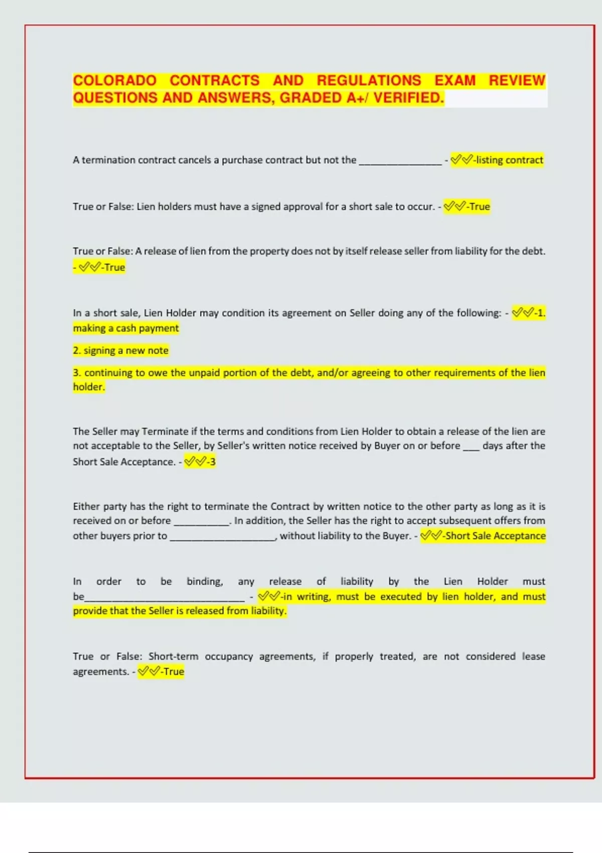 COLORADO CONTRACTS AND REGULATIONS EXAM REVIEW QUESTIONS AND ANSWERS, GRADED A+/ VERIFIED. A termination contract cancels a purchase contract but not the _______________ - -listing contract True or False: Lien holders must have a signed approval for a short sale to occur. - -True True or False: A release of lien from the property does not by itself release seller from liability for the debt. - -True In a short sale, Lien Holder may condition its agreement on Seller doing any of the following: - -1. making a cash payment 2. signing a new note 3. continuing to owe the unpaid portion of the debt, and/or agreeing to other requirements of the lien holder. The Seller may Terminate if the terms and conditions from Lien Holder to obtain a release of the lien are not acceptable to the Seller, by Seller's written notice received by Buyer on or before ___ days after the Short Sale Acceptance. - -3