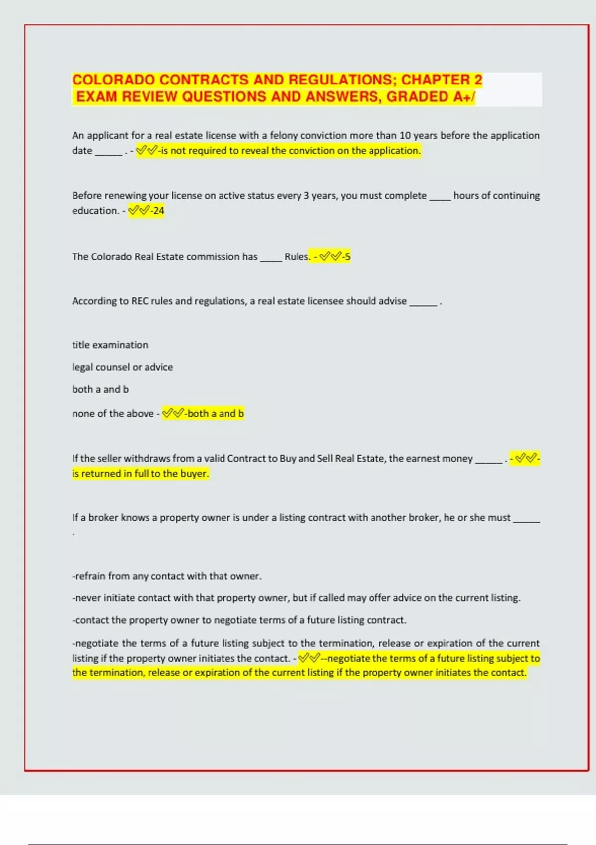 COLORADO CONTRACTS AND REGULATIONS; CHAPTER 2 EXAM REVIEW QUESTIONS AND ANSWERS, GRADED A+/ An applicant for a real estate license with a felony conviction more than 10 years before the application date _____ . - -is not required to reveal the conviction on the application. Before renewing your license on active status every 3 years, you must complete ____ hours of continuing education. - -24 The Colorado Real Estate commission has ____ Rules. - -5 According to REC rules and regulations, a real estate licensee should advise _____ . title examination legal counsel or advice both a and b none of the above - -both a and b If the seller withdraws from a valid Contract to Buy and Sell Real Estate, the earnest money _____ . - - is returned in full to the buyer. If a broker knows a property owner is under a listing contract with another broker, he or she must _____ . -refrain from any contact with that owner. -never initiate contact with that property owner, but if called may offer advice on the current listing. -contact the property owner to negotiate terms of a future listing contract. -negotiate the terms of a future listing subject to the termination, release or expiration of the current listing if the property owner initiates the contact. - --negotiate the terms of a future listing subject to the termination, release or expiration of the current listing if the property owner initiates the contact. According to Commission rule, every listing/employment agreement must include the date of the _____ . contract termination. commission payment. earnest money deposit. CMA supporting the list price. - -contract termination. A broker for a corporation must _____ . be licensed as a broker. be an officer and director with voting rights. have more than a nominal financial interest in the corporation. all of these. - -be licensed as a broker. If at closing, a seller refuses to pay a broker's co