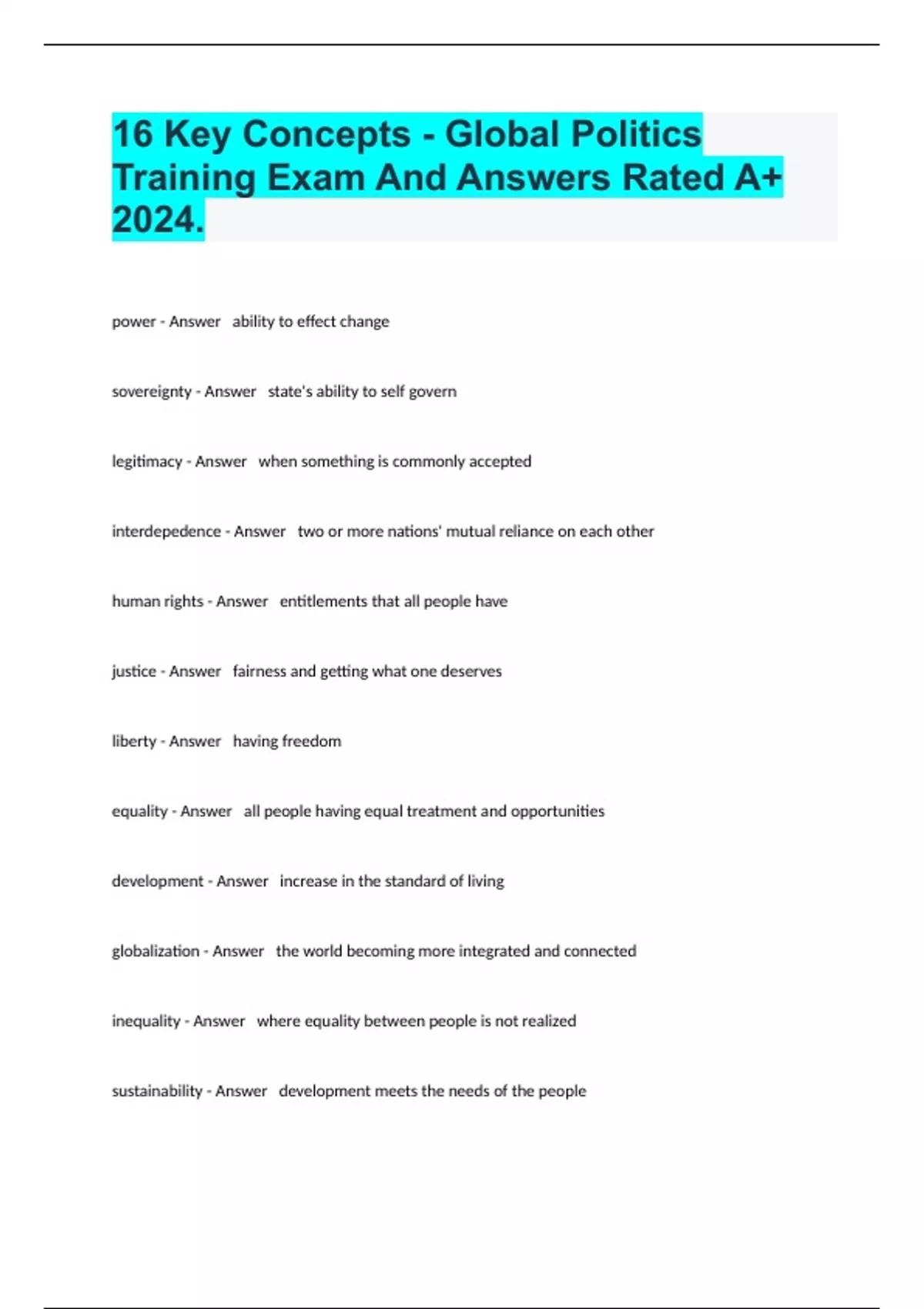 16 Key Concepts - Global Politics Training Exam And Answers Rated A+ 2024.