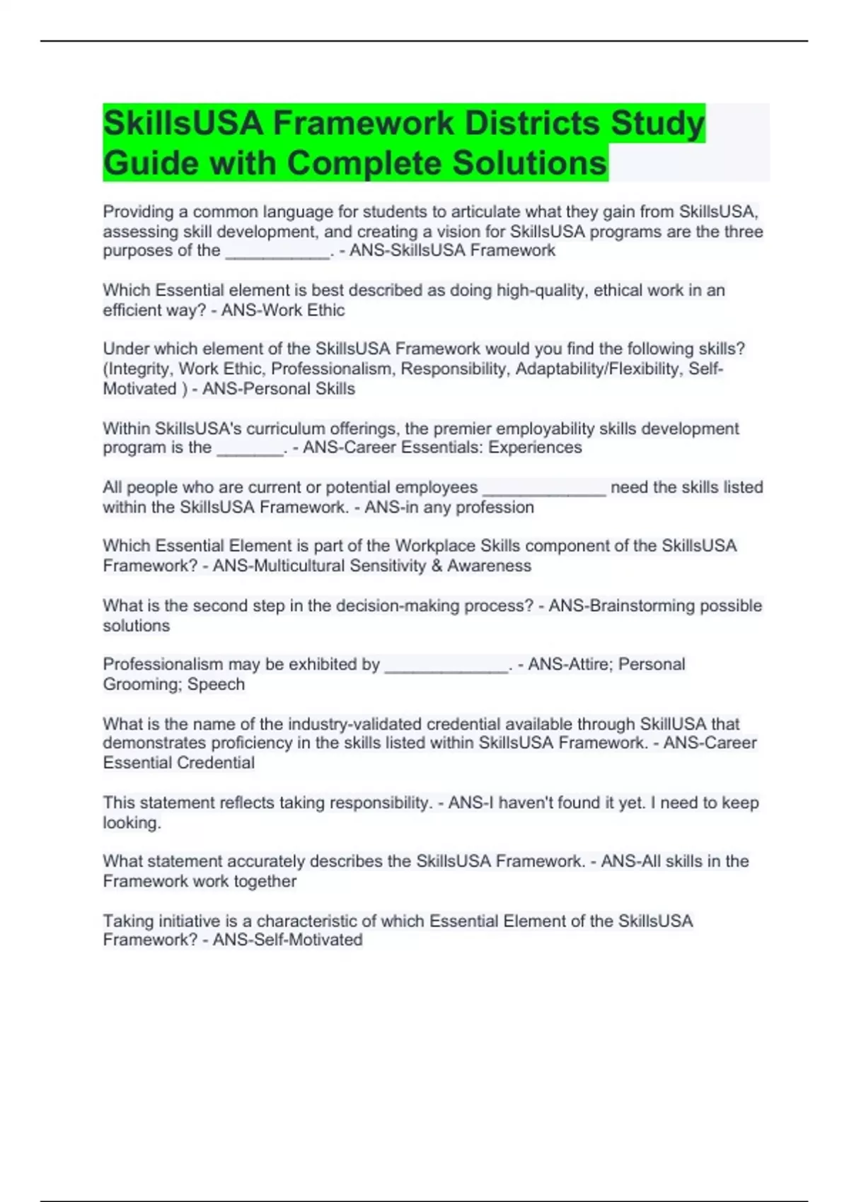 SkillsUSA Framework Districts Study Guide with Complete Solutions