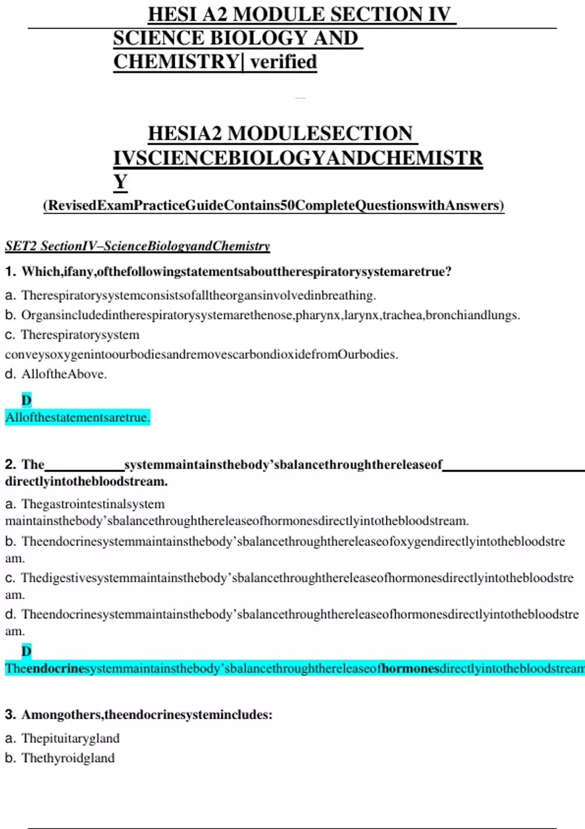 HESI A2 MODULE SECTION IV SCIENCE BIOLOGY AND CHEMISTRY verified