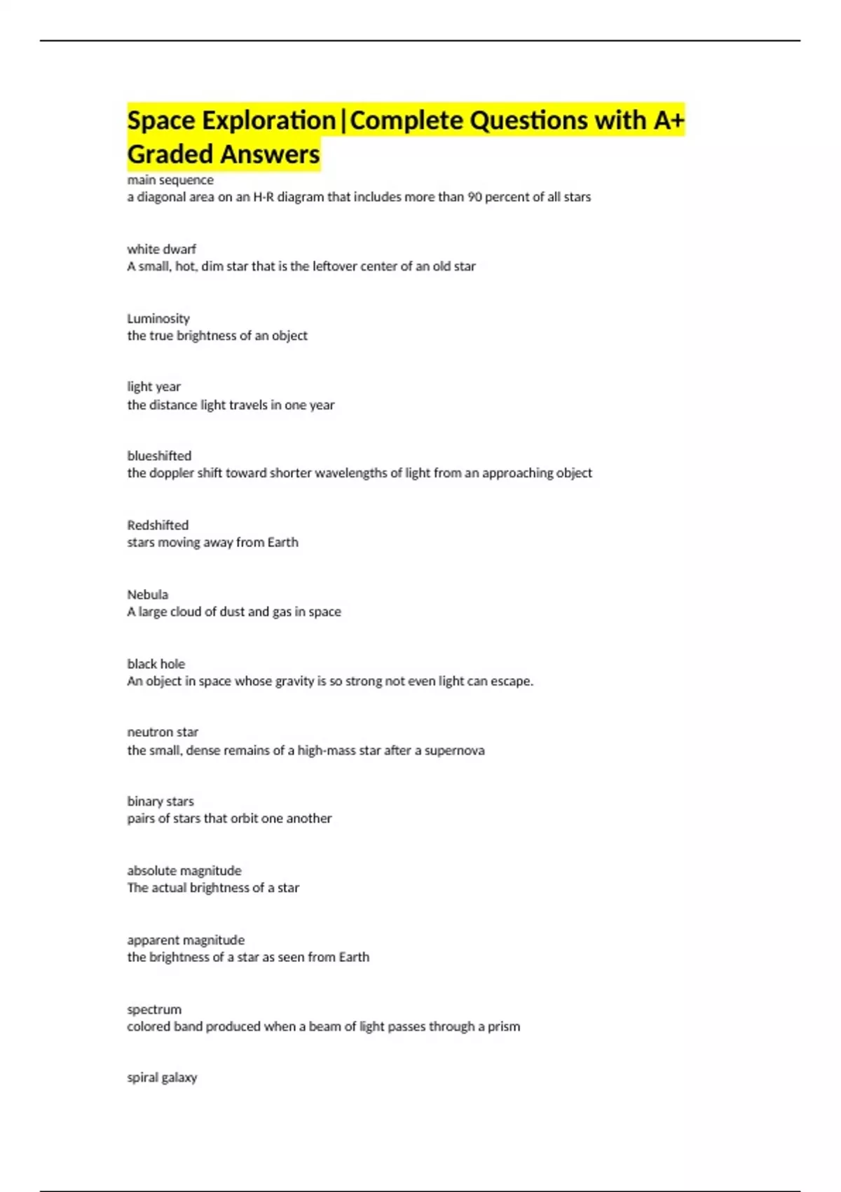 Space Exploration|Complete Questions with A+ Graded Answers main sequence a diagonal area on an H-R diagram that includes more than 90 percent of all stars white dwarf A small, hot, dim star that is the leftover center of an old star Luminosity the true brightness of an object light year the distance light travels in one year blueshifted the doppler shift toward shorter wavelengths of light from an approaching object Redshifted stars moving away from Earth Nebula A large cloud of dust and gas in space black hole An object in space whose gravity is so strong not even light can escape. neutron star the small, dense remains of a high-mass star after a supernova binary stars pairs of stars that orbit one another absolute magnitude The actual brightness of a star apparent magnitude the brightness of a star as seen from Earth spectrum colored band produced when a beam of light passes through a prism spiral galaxy