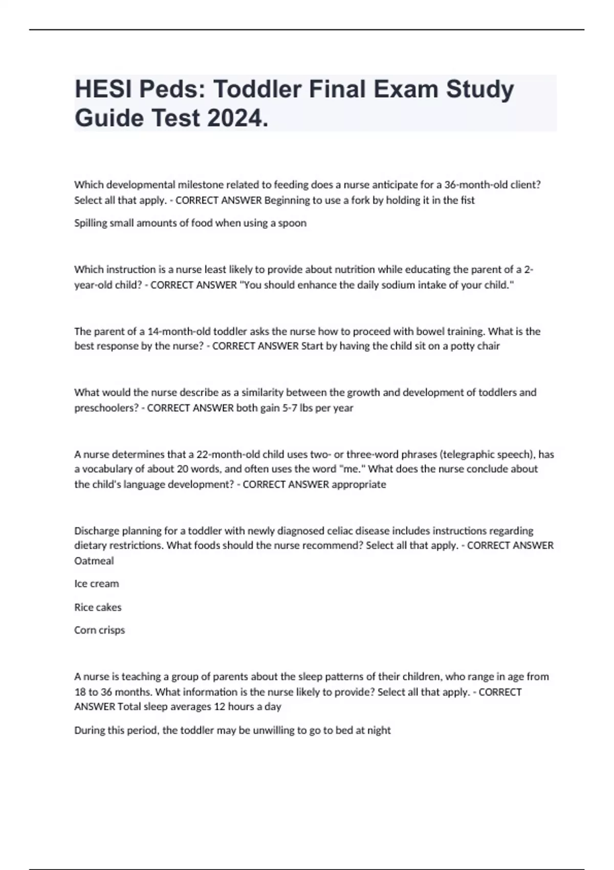 HESI Peds: Toddler Final Exam Study Guide Test 2024. Which developmental milestone related to feeding does a nurse anticipate for a 36-month-old client? Select all that apply. - CORRECT ANSWER Beginning to use a fork by holding it in the fist Spilling small amounts of food when using a spoon Which instruction is a nurse least likely to provide about nutrition while educating the parent of a 2-year-old child? - CORRECT ANSWER "You should enhance the daily sodium intake of your child." The parent of a 14-month-old toddler asks the nurse how to proceed with bowel training. What is the best response by the nurse? - CORRECT ANSWER Start by having the child sit on a potty chair What would the nurse describe as a similarity between the growth and development of toddlers and preschoolers? - CORRECT ANSWER both gain 5-7 lbs per year A nurse determines that a 22-month-old child uses two- or three-word phrases (telegraphic speech), has a vocabulary of about 20 words, and often uses the word "me." What does the nurse conclude about the child's language development? - CORRECT ANSWER appropriate Discharge planning for a toddler with newly diagnosed celiac disease includes instructions regarding dietary restrictions. What foods should the nurse recommend? Select all that apply. - CORRECT ANSWER Oatmeal Ice cream Rice cakes Corn crisps A nurse is teaching a group of parents about the sleep patterns of their children, who range in age from 18 to 36 months. What information is the nurse likely to provide? Select all that apply. - CORRECT ANSWER Total sleep averages 12 hours a day