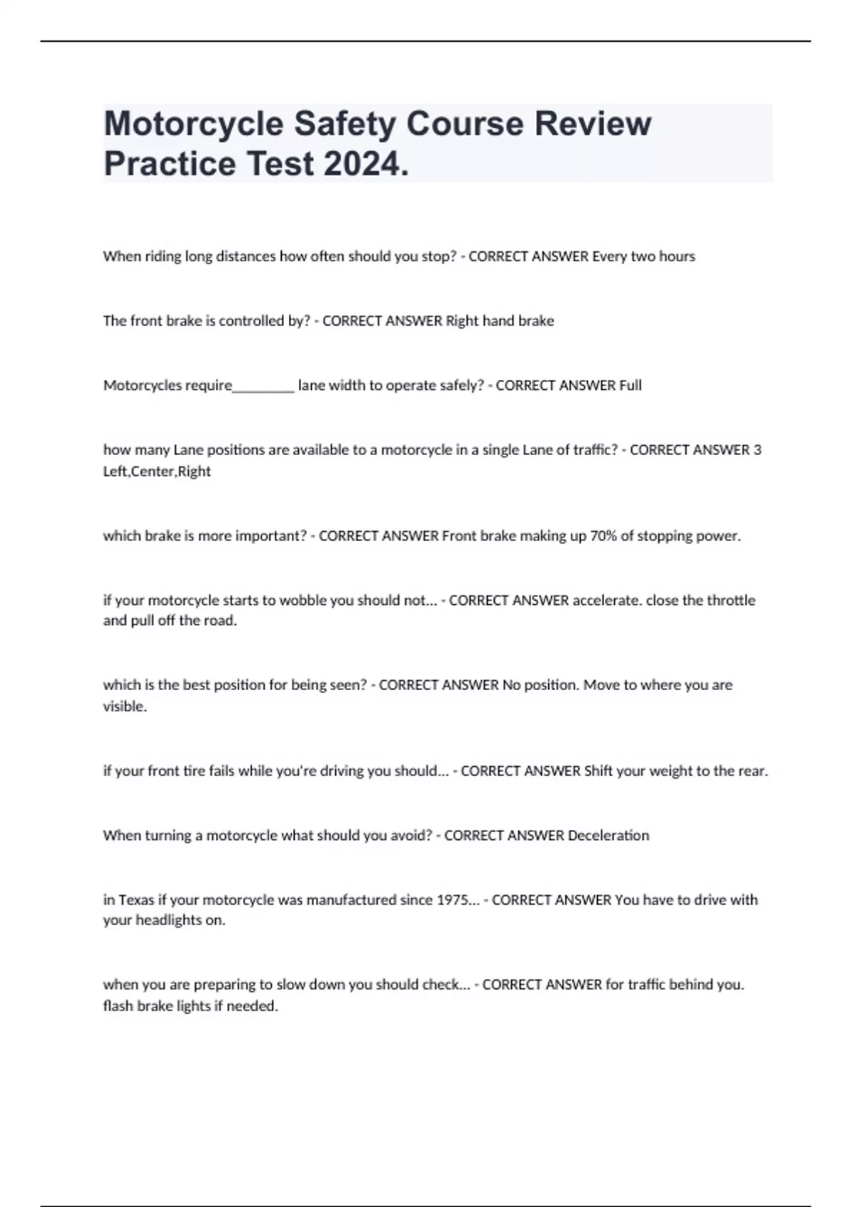 Motorcycle Safety Course Review Practice Test 2024. When riding long distances how often should you stop? - CORRECT ANSWER Every two hours The front brake is controlled by? - CORRECT ANSWER Right hand brake Motorcycles require________ lane width to operate safely? - CORRECT ANSWER Full how many Lane positions are available to a motorcycle in a single Lane of traffic? - CORRECT ANSWER 3 Left,Center,Right which brake is more important? - CORRECT ANSWER Front brake making up 70% of stopping power. if your motorcycle starts to wobble you should not... - CORRECT ANSWER accelerate. close the throttle and pull off the road. which is the best position for being seen? - CORRECT ANSWER No position. Move to where you are visible. if your front tire fails while you're driving you should... - CORRECT ANSWER Shift your weight to the rear. When turning a motorcycle what should you avoid? - CORRECT ANSWER Deceleration in Texas if your motorcycle was manufactured since 1975... - CORRECT ANSWER You have to drive with your headlights on. when you are preparing to slow down you should check... - CORRECT ANSWER for traffic behind you. flash brake lights if needed. before pulling off the road you must check... - CORRECT ANSWER check services to see if safe to ride. when you ride at night you should... - CORRECT ANSWER slow to speed that allows you to stop within the range of your headlight. if you take a turn too fast you may end up... - CORRECT ANSWER driving into another Lane. a motorcycle is less visible in a car because it... - CORRECT ANSWER it has a smaller profile. to stop safely in a curve what should you do? - CORRECT ANSWER straighten your cycle upright how can you increase your visibility at blind intersections? - CORRECT ANSWER ride in any Lane that allows you to be seen ASAP.