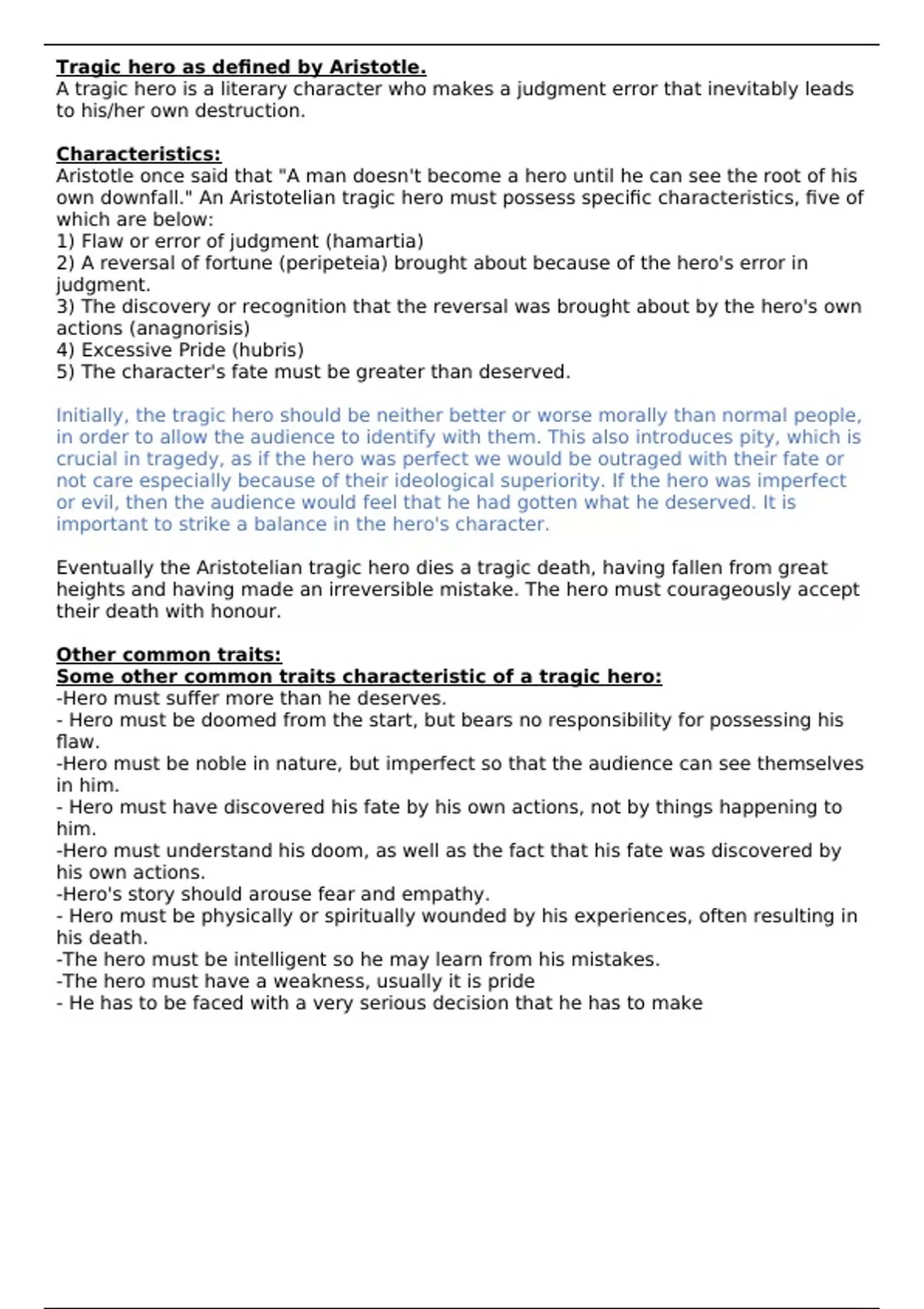 own downfall." An Aristotelian tragic hero must possess specific characteristics, five of