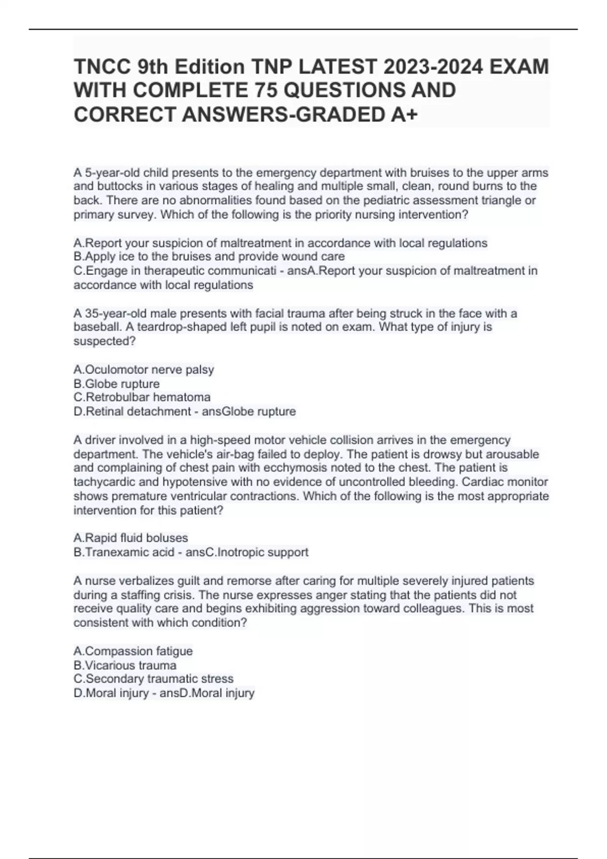 TNCC 9th Edition TNP LATEST EXAM WITH COMPLETE 75 QUESTIONS AND CORRECT ANSWERS-GRADED A+