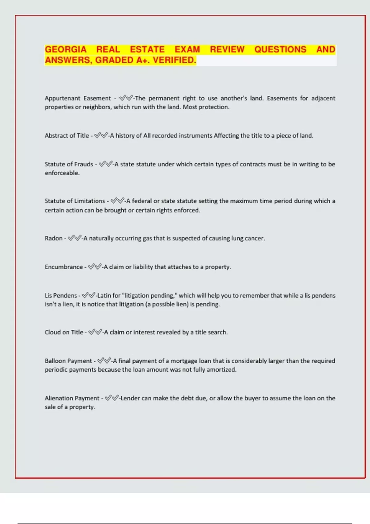 GEORGIA REAL ESTATE EXAM REVIEW QUESTIONS AND ANSWERS, GRADED A+. VERIFIED. Appurtenant Easement - -The permanent right to use another's land. Easements for adjacent properties or neighbors, which run with the land. Most protection. Abstract of Title - -A history of All recorded instruments Affecting the title to a piece of land. Statute of Frauds - -A state statute under which certain types of contracts must be in writing to be enforceable. Statute of Limitations - -A federal or state statute setting the maximum time period during which a certain action can be brought or certain rights enforced. Radon - -A naturally occurring gas that is suspected of causing lung cancer. Encumbrance - -A claim or liability that attaches to a property. Lis Pendens - -Latin for "litigation pending," which will help you to remember that while a lis pendens isn't a lien, it is notice that litigation (a possible lien) is pending. Cloud on Title - -A claim or interest revealed by a title search. Balloon Payment - -A final payment of a mortgage loan that is considerably larger than the required periodic payments because the loan amount was not fully amortized. Alienation Payment - -Lender can make the debt due, or allow the buyer to assume the loan on the sale of a property. Easement in Gross - -Is not created for the benefit of the land owned by the owner of the easement, but that ATTACHES PERSONALLY TO THE EASEMENT OWNER.