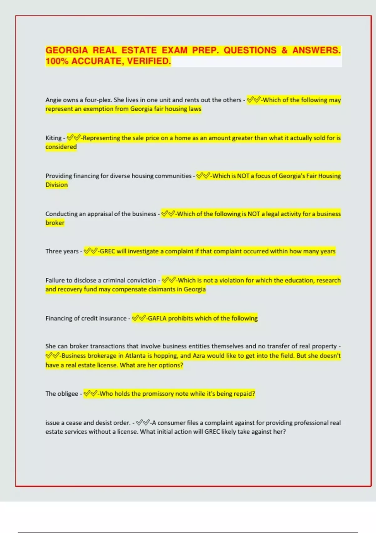 GEORGIA REAL ESTATE EXAM PREP. QUESTIONS & ANSWERS. 100% ACCURATE, VERIFIED. Angie owns a four-plex. She lives in one unit and rents out the others - -Which of the following may represent an exemption from Georgia fair housing laws Kiting - -Representing the sale price on a home as an amount greater than what it actually sold for is considered Providing financing for diverse housing communities - -Which is NOT a focus of Georgia's Fair Housing Division Conducting an appraisal of the business - -Which of the following is NOT a legal activity for a business broker Three years - -GREC will investigate a complaint if that complaint occurred within how many years Failure to disclose a criminal conviction - -Which is not a violation for which the education, research and recovery fund may compensate claimants in Georgia Financing of credit insurance - -GAFLA prohibits which of the following She can broker transactions that involve business entities themselves and no transfer of real property - -Business brokerage in Atlanta is hopping, and Azra would like to get into the field. But she doesn't have a real estate license. What are her options? The obligee - -Who holds the promissory note while it's being repaid? issue a cease and desist order. - -A consumer files a complaint against for providing professional real estate services without a license. What initial action will GREC likely take against her? Statutory Right of Redemption - -The right of a borrower to redeem a property by paying amount owed plus cost, even after the foreclosure sale No, because of the number of units - -Karen and Joe are purchasing a six-unit apartment complex for $450,000. The loan is secured by the property being purchased. Is this purchase subject to GRMFA provisions ? It is based on the amount borrowed, and it is $1.50 per each $500 or fractional part thereof, with a maximum of $25,000. - -How is Georgia intangible tax computed ? Survival of the Agreement - -Which section of the sale contract says that certain unmet obligations will continue or be completed even after closing ? Valid - -Aubrey, an attorney for the seller, was extremely satisfied with the purchase offer his client was planning to sign. The sale contract contained all of the essential elements. What type of contract is this? To hold legal title to the property on behalf of the beneficiary until the loan is repaid - -What is the trustee's role when a deed of trust is used to secure property fora loan ? Transfer Tax - -In Georgia which of the following