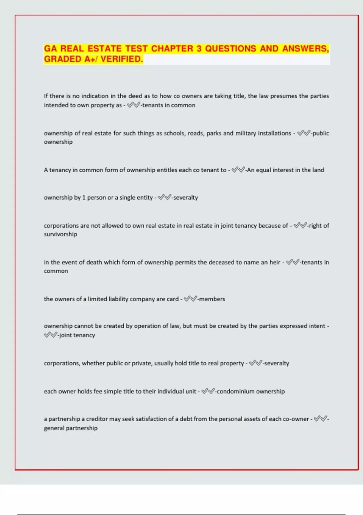 GA REAL ESTATE TEST CHAPTER 3 QUESTIONS AND ANSWERS, GRADED A+/ VERIFIED. If there is no indication in the deed as to how co owners are taking title, the law presumes the parties intended to own property as - -tenants in common ownership of real estate for such things as schools, roads, parks and military installations - -public ownership A tenancy in common form of ownership entitles each co tenant to - -An equal interest in the land ownership by 1 person or a single entity - -severalty corporations are not allowed to own real estate in real estate in joint tenancy because of - -right of survivorship in the event of death which form of ownership permits the deceased to name an heir - -tenants in common the owners of a limited liability company are card - -members ownership cannot be created by operation of law, but must be created by the parties expressed intent - -joint tenancy corporations, whether public or private, usually hold title to real property - -severalty each owner holds fee simple title to their individual unit - -condominium ownership a partnership a creditor may seek satisfactio