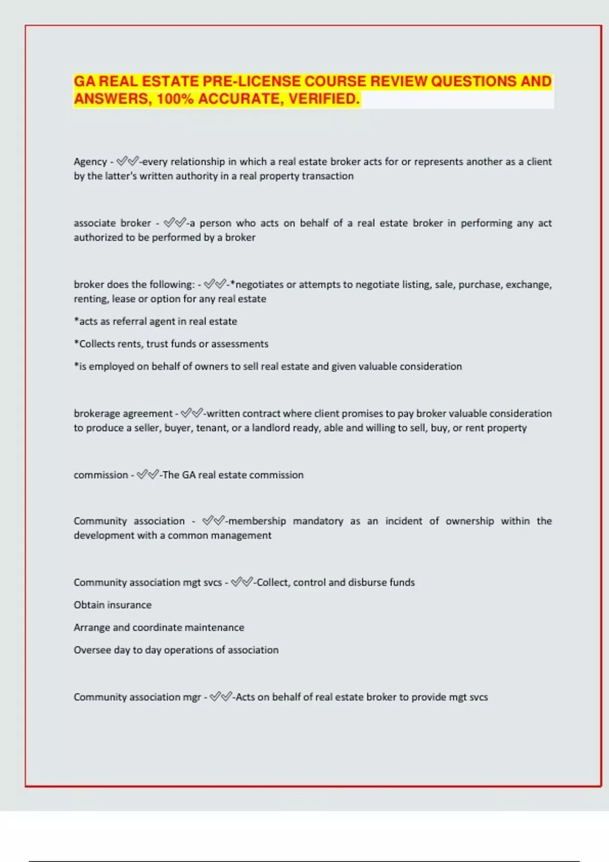 GA REAL ESTATE PRE-LICENSE COURSE REVIEW QUESTIONS AND ANSWERS, 100% ACCURATE, VERIFIED. Agency - -every relationship in which a real estate broker acts for or represents another as a client by the latter's written authority in a real property transaction associate broker - -a person who acts on behalf of a real estate broker in performing any act authorized to be performed by a broker broker does the following: - -*negotiates or attempts to negotiate listing, sale, purchase, exchange, renting, lease or option for any real estate *acts as referral agent in real estate *Collects rents, trust funds or assessments *is employed on behalf of owners to sell real estate and given valuable consideration brokerage agreement - -written contract where client promises to pay broker valuable consideration to produce a seller, buyer, tenant, or a landlord ready, able and willing to sell, buy, or rent property commission - -The GA real estate commission Community association - -membership mandatory as an incident of ownership within the development with a common management Community association mgt svcs - -Collect, control and disburse funds Obtain insurance Arrange and coordinate maintenance Oversee day to day operations of association Community association mgr - -Acts on behalf of real estate broker to provide mgt svcs Firm - -any business entity Licensee - -any person licensed as a comm assoc mgr, salesperson, assoc broker or broker Real estate - -condos and leaseholds, as well as any other interest in estate or land, includes mobile homes if affixed to land Purpose of Ga real estate law - -to protect the public; to protect real estate acts from unfair competition and lay out standards for licensees to abide by The administration of law falls under - -The GA Real Estate Commission 6 members of Commission, rules - -*5 of 6 must be licensees who have had license min of 5 yrs and state res min 5 yrs *6th member must not have interest in real estate industry *Terms of 5 yrs each *Only one licensee can expire each yr If a vacancy occurs on Commission - -will be filled by governor Reasons to remove a Commission member - -*incom