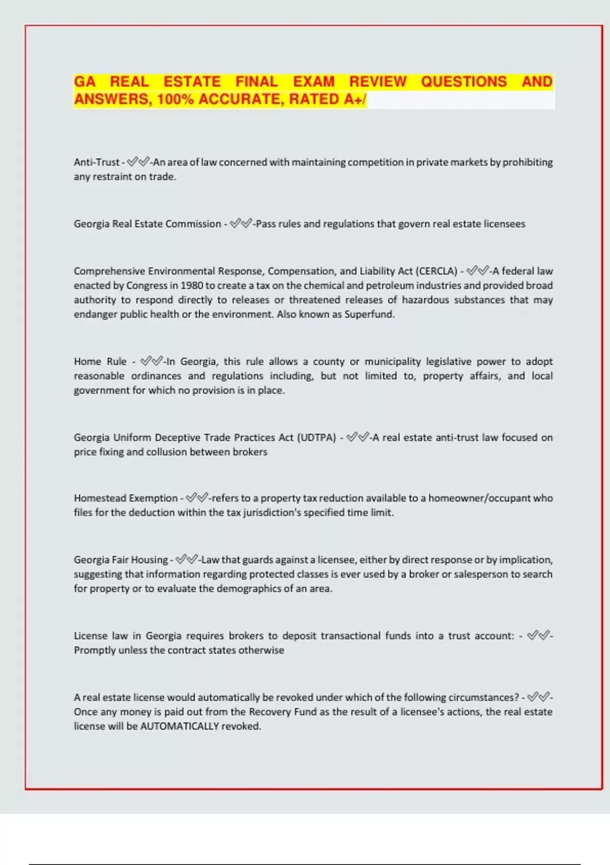 GA REAL ESTATE FINAL EXAM REVIEW QUESTIONS AND ANSWERS, 100% ACCURATE, RATED A+/ Anti-Trust - -An area of law concerned with maintaining competition in private markets by prohibiting any restraint on trade. Georgia Real Estate Commission - -Pass rules and regulations that govern real estate licensees Comprehensive Environmental Response, Compensation, and Liability Act (CERCLA) - -A federal law enacted by Congress in 1980 to create a tax on the chemical and petroleum industries and provided broad authority to respond directly to releases or threatened releases of hazardous substances that may endanger public health or the environment. Also known as Superfund. Home Rule - -In Georgia, this rule allows a county or municipality legislative power to adopt reasonable ordinances and regulations including, but not limited to, property affairs, and local government for which no provision is in place. Georgia Uniform Deceptive Trade Practices Act (UDTPA) - -A real estate anti-trust law focused on price fixing and collusion between brokers Homestead Exemption - -refers to a property tax reduction available to a homeowner/occupant who files for the deduction within the tax jurisdiction's specified time limit. Georgia Fair Housing - -Law that guards against a licensee, either by direct response or by implication, suggesting that information regarding protected classes is ever used by a broker or salesperson to search for property or to evaluate the demographics of an area. License law in Georgia requires brokers to deposit transactional funds into a trust account: - - Promptly unless the contract states otherwise A real estate license would automatically be revoked under which of the following circumstances? - - Once any money is paid out from the Recovery Fund as the result of a licensee's actions, the real estate license will be AUTOMATICALLY revoked. All Georgia real estate offices must: - -License law requires brokers to keep transactional records for at least three years The statute of frauds... - -must be in writing to avoid f