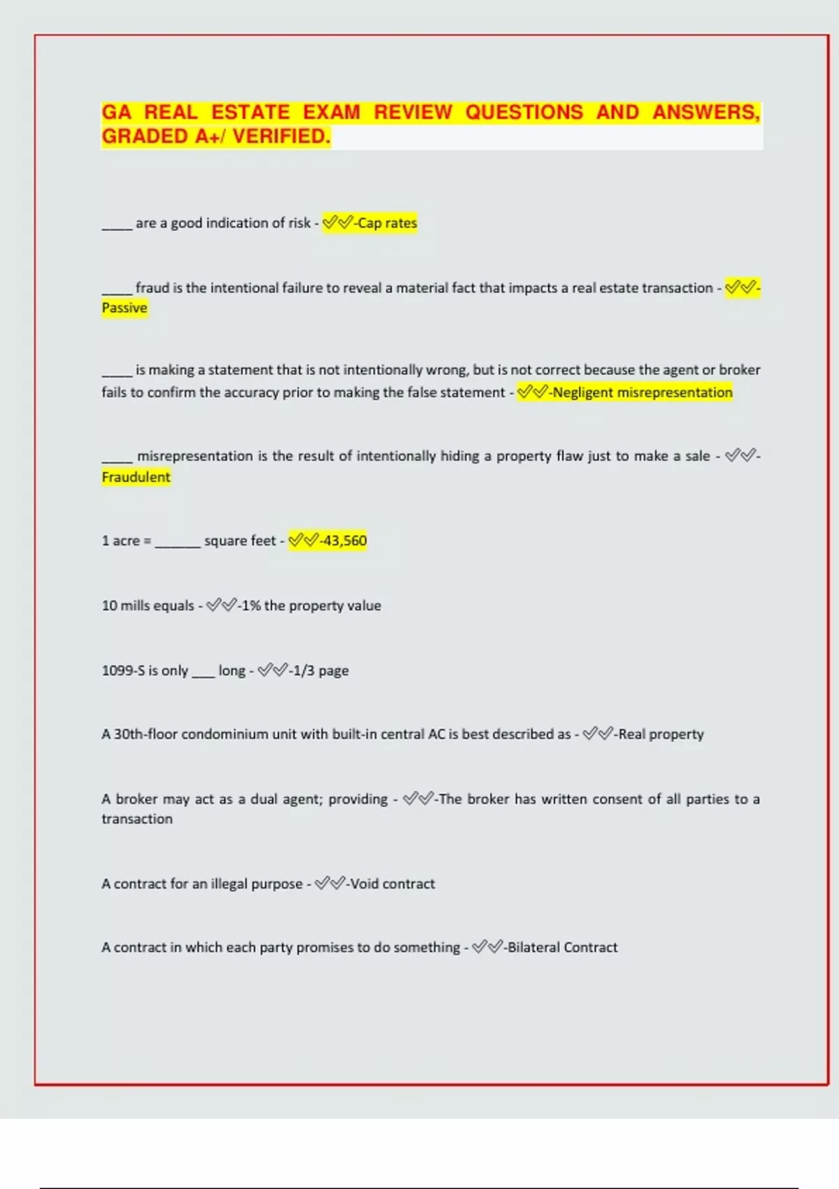 GA REAL ESTATE EXAM REVIEW QUESTIONS AND ANSWERS, GRADED A+/ VERIFIED. ____ are a good indication of risk - -Cap rates ____ fraud is the intentional failure to reveal a material fact that impacts a real estate transaction - - Passive ____ is making a statement that is not intentionally wrong, but is not correct because the agent or broker fails to confirm the accuracy prior to making the false statement - -Negligent misrepresentation ____ misrepresentation is the result of intentionally hiding a property flaw just to make a sale - - Fraudulent 1 acre = ______ square feet - -43,560 10 mills equals - -1% the property value 1099-S is only ___ long - -1/3 page A 30th-floor condominium unit with built-in central AC is best described as - -Real property A broker may act as a dual agent; providing - -The broker has written consent of all parties to a transaction A contract for an illegal purpose - -Void contract A contract in which each party promises to do something - -Bilateral Contract A contract in which one party promises to do something if the other party performs a certain act, but the other party does not promise to perform it - -Unilateral Contract A contract that allows someone to possess and use real property for a specified time - -Lease A contract that has been put into words, either spoken or written - -Express Contract A contract that lacks consideration - -Void contract A contract where on transaction depends upon another - -Tie-in Arrangement A court may create this type of easement if an encroachment was open, notorious, hostile, and continuous for a period of years - -Prescriptive easement A home is up for sale at $275,000. A new home that is similar can be built for $250,000. What principle applies? - -The principle of substitution A license to property - -Limited privilege to use land in the possession of the licensor. NOT a property interest; Licenses are contract rights.