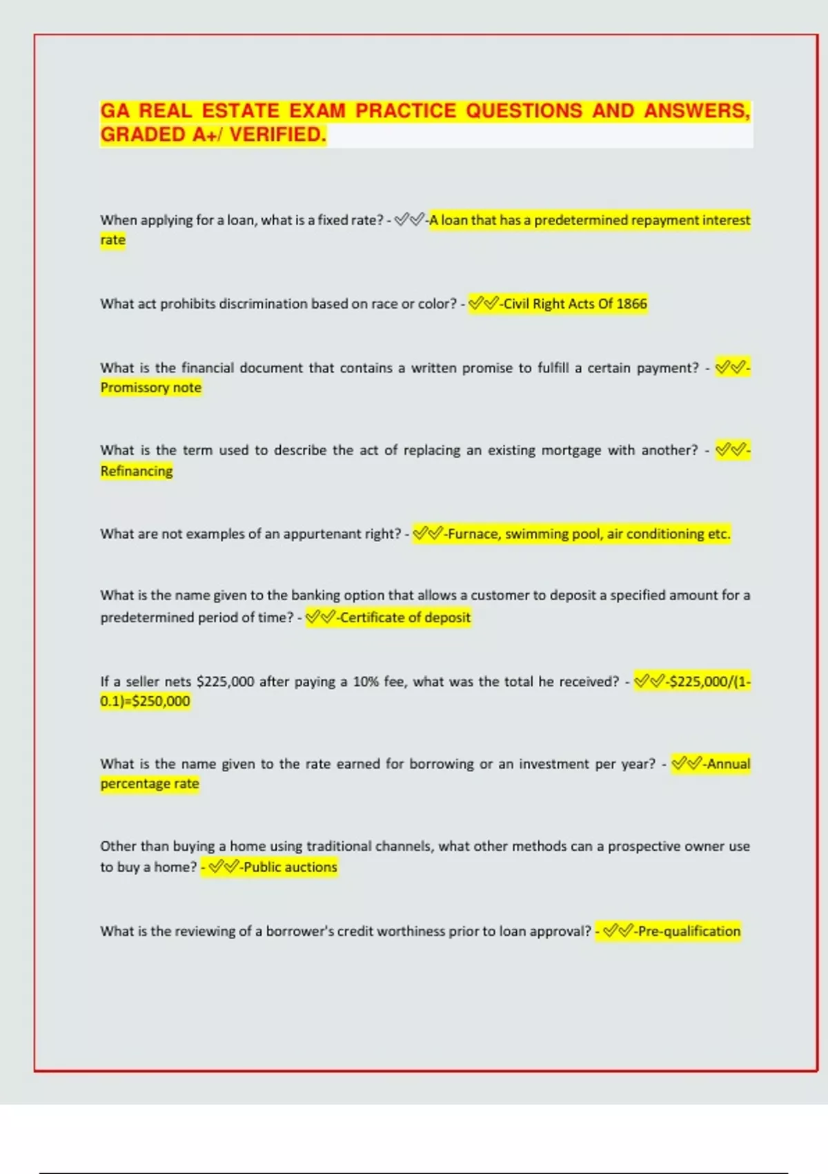 GA REAL ESTATE EXAM PRACTICE QUESTIONS AND ANSWERS, GRADED A+/ VERIFIED.| latest update 2024/25|
