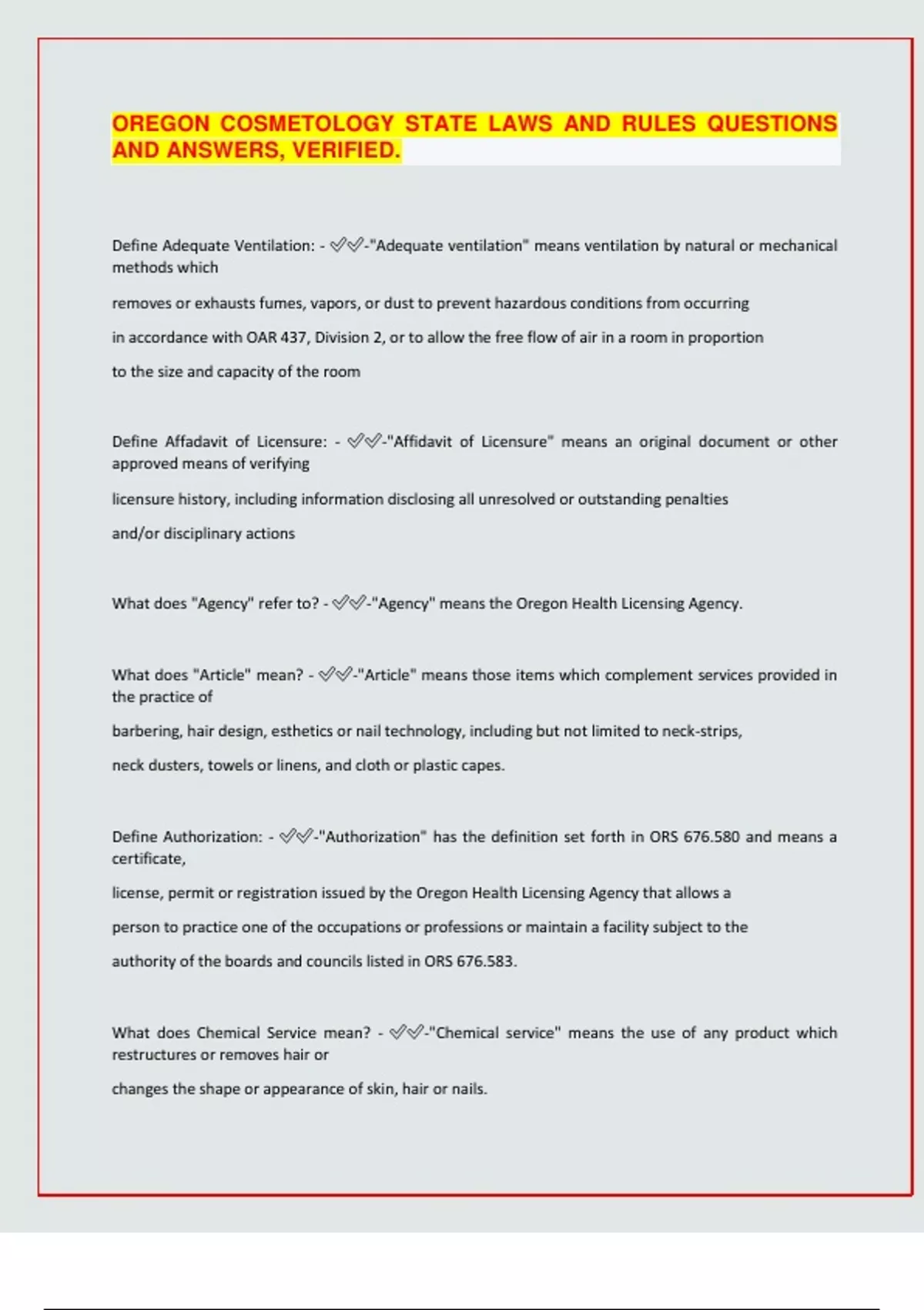 OREGON COSMETOLOGY STATE LAWS AND RULES QUESTIONS AND ANSWERS, VERIFIED. Define Adequate Ventilation: - -"Adequate ventilation" means ventilation by natural or mechanical methods which removes or exhausts fumes, vapors, or dust to prevent hazardous conditions from occurring in accordance with OAR 437, Division 2, or to allow the free flow of air in a room in proportion to the size and capacity of the room Define Affadavit of Licensure: - -"Affidavit of Licensure" means an original document or other approved means of verifying licensure history, including information disclosing all unresolved or outstanding penalties and/or disciplinary actions What does "Agency" refer to? - -"Agency" means the Oregon Health Licensing Agency. What does "Article" mean? - -"Article" means those items which complement services provided in the practice of barbering, hair design, esthetics or nail technology, including but not limited to neck-strips, neck dusters, towels or linens, and cloth or plastic capes. Define Authorization: - -"Authorization" has the definition set forth in ORS 676.580 and means a certificate, license, permit or registration issued by the Oregon Health Licensing Agency that allows a person to practice one of the occupations or professions or maintain a facility subject to the authority of the boards and councils listed in ORS 676.583. What does Chemical Service mean? - -"Chemical service" means the use of any product which restructures or removes hair or changes the shape or appearance of skin, hair or nails. What does a "Common Area" mean? - -"Common area" means an area of a facility which is used by all authorization holders performing services, including, but not limited to reception areas, dispensing areas, sinks, shampoo bowls, hair dryers, hair dryer areas and employee lounges. What does "Disinfect" mean? - -"Disinfect" means using a process to destroy harmful organisms, including bacteria, viruses, germs and fungi. What does "Dispensing Area" mean? - -"Dispensing area" means an area with non-porous surfaces and a sink with hot and cold running water where service preparations are conducted, including, but not limited to, mixing of chemicals, cleaning of tools and equipment, disposing of residues and rinsing parts of the body exposed to chemicals. What qualifies as an educational institution? - -"Educational Institution" means an Oregon high school under ORS 335, Oregon career school licensed under ORS 345 or an Oregon community college under ORS 341. Define "EPA": - -"EPA" means Environmental Protection Agency, a branch of the federal government, which approves and registers chemical compounds and agents. What does Equiptment mean? - -"Equipment" mean
