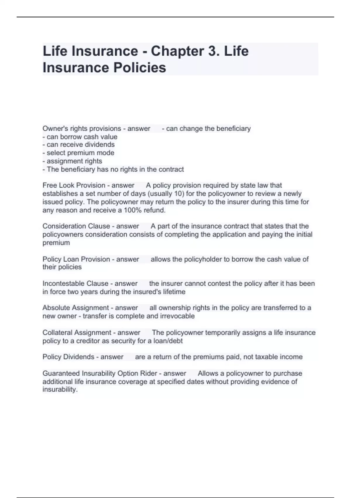 Life Insurance - Chapter 3. Life Insurance Policies Questions and Answers Graded A+