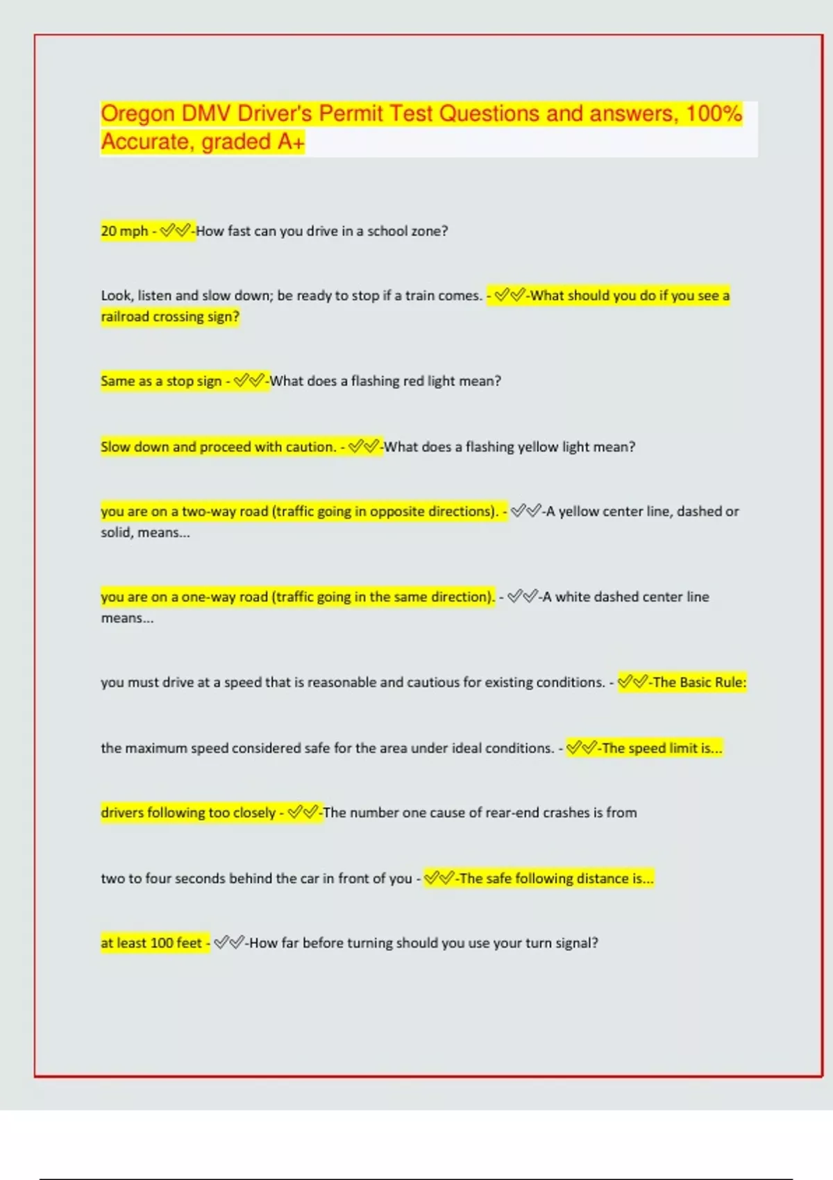 Oregon DMV Driver's Permit Test Questions and answers, 100% Accurate, graded A+ 20 mph - -How fast can you drive in a school zone? Look, listen and slow down; be ready to stop if a train comes. - -What should you do if you see a railroad crossing sign? Same as a stop sign - -What does a flashing red light mean? Slow down and proceed with caution. - -What does a flashing yellow light mean? you are on a two-way road (traffic going in opposite directions). - -A yellow center line, dashed or solid, means... you are on a one-way road (traffic going in the same direction). - -A white dashed center line means... you must drive at a speed that is reasonable and cautious for existing conditions. - -The Basic Rule: the maximum speed considered safe for the area under ideal conditions. - -The speed limit is... drivers following too closely - -The number one cause of rear-end crashes is from two to four seconds behind the car in front of you - -The safe following distance is... at least 100 feet - -How far before turning should you use your turn signal? turn into the closest legal lane in the direction you want to go - -General rule for turning: just to the right of the center line. - -When turning into a street, drive... any vehicles already on the road. - -When you enter a freeway or other highway, give the right of way to... straight ahead. - -When preparing to make a left turn, keep your wheels pointed... human error - -Most common cause of traffic crashes pull into a rest station and sleep. - -If you are sleepy while driving you should... False - -True or false: it is safe to wear headphones while driving. at least 10 seconds - -You should scan the driving scene how far ahead? glancing over your left shoulder. - -When turning left, check your blind spot by... slow down to encourage the tailgater to pass you. - -If a vehicle behind you is following to closely, you should... getting out and walking behind the vehicle to check for children, pets