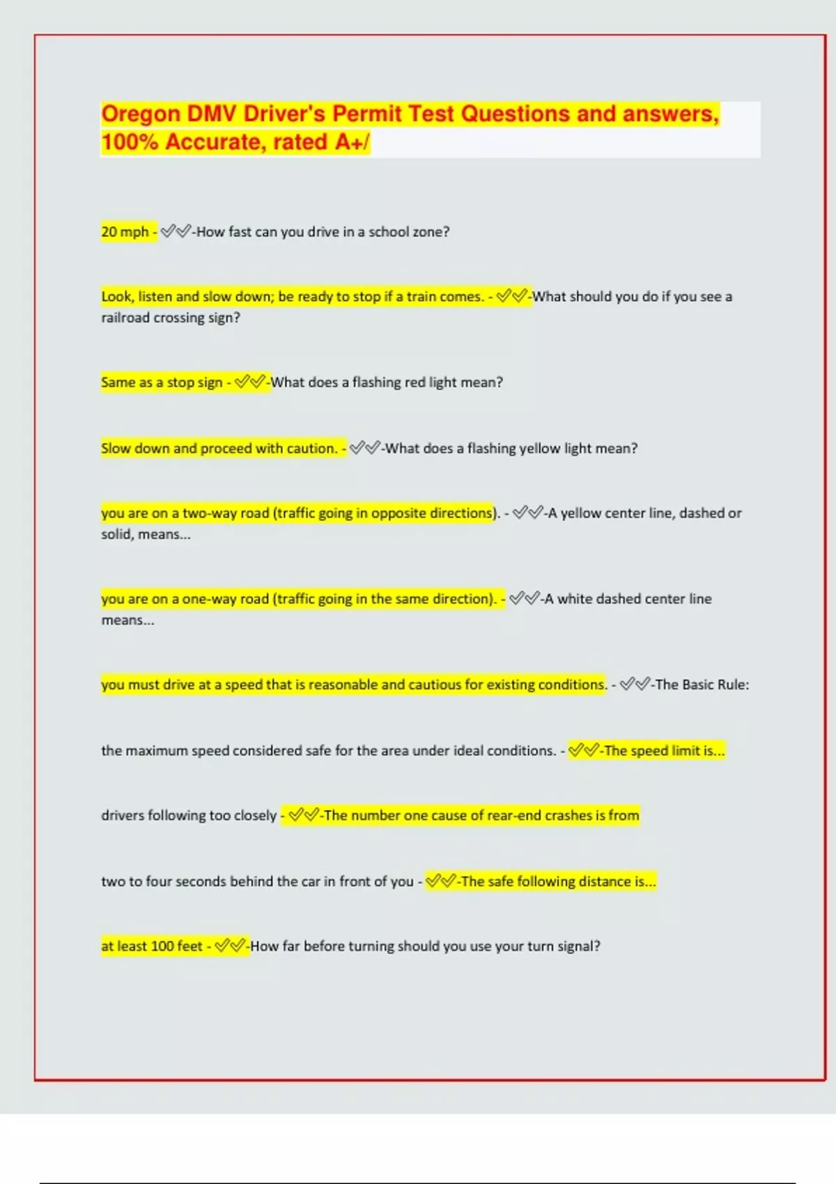 Oregon DMV Driver's Permit Test Questions and answers, 100% Accurate, rated A+/ 20 mph - -How fast can you drive in a school zone? Look, listen and slow down; be ready to stop if a train comes. - -What should you do if you see a railroad crossing sign? Same as a stop sign - -What does a flashing red light mean? Slow down and proceed with caution. - -What does a flashing yellow light mean? you are on a two-way road (traffic going in opposite directions). - -A yellow center line, dashed or solid, means... you are on a one-way road (traffic going in the same direction). - -A white dashed center line means... you must drive at a speed that is reasonable and cautious for existing conditions. - -The Basic Rule: the maximum speed considered safe for the area under ideal conditions. - -The speed limit is... drivers following too closely - -The number one cause of rear-end crashes is from two to four seconds behind the car in front of you - -The safe following distance is... at least 100 feet - -How far before turning should you use your turn signal? turn into the closest legal lane in the direction you want to go - -General rule for turning: just to the right of the center line. - -When turning into a street, drive... any vehicles already on the road. - -When you enter a freeway or other highway, give the right of way to... straight ahead. - -When preparing to make a left turn, keep your wheels pointed... human error - -Most common cause of traffic crashes pull into a rest station and sleep. - -If you are sleepy while driving you should... False - -True or false: it is safe to wear headphones while driving. at least 10 seconds - -You should scan the driving scene how far ahead? glancing over your left shoulder. - -When turning left, check your blind spot by... slow down to encourage the tailgater to pass you. -