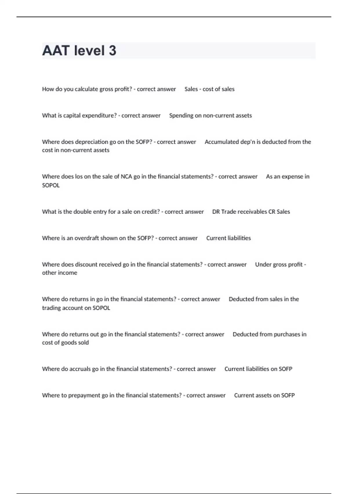 How do you calculate gross profit? - correct answer Sales - cost of sales What is capital expenditure? - correct answer Spending on non-current assets Where does depreciation go on the SOFP? - correct answer Accumulated dep'n is deducted from the cost in non-current assets Where does los on the sale of NCA go in the financial statements? - correct answer As an expense in SOPOL What is the double entry for a sale on credit? - correct answer DR Trade receivables CR Sales Where is an overdraft shown on the SOFP? - correct answer Current liabilities Where does discount received go in the financial statements? - correct answer Under gross profit - other income Where do returns in go in the financial statements? - correct answer Deducted from sales in the trading account on SOPOL Where do returns out go in the financial statements? - correct answer Deducted from purchases in cost of goods sold Where do accruals go in the financial statements? - correct answer Current liabilities on SOFP Where to prepayment go in the financial statements? - correct answer Current assets on SOFP Which side of the cash account do bank charges go? - correct answer Credit Where does depreciation go in the SOPOL? - correct answer Expenses What is the double entry for drawing cash from the bank? - correct answer DR Bank CR Cash Herbert has paid £8k in advertising. £1K is prepaid. How much goes to expenses? - correct answer £7K What is the double entry when the owner takes goods for their own use? - correct answer DR Drawings CR Purchases Where does discount allowed go in SOPOL? - correct answer Expenses Which side does discount received go in the PLCA? - correct answer Debit Opening TR £10K, Credit sales £5K, Payments received £8k. What is closing TR balance? - correct answer £7K In a bank reconciliation what do you do with uncleared credits? - correct answer Deduct them from the cash balance What is error of reversal of entries? - correct answer Where DR and CR are on the wrong side in right accounts What is double entry for sales return from credit customer? - correct answer DR Sales returns CR SLCA Which side does the b/d go on provision for depreciation? - correct answer Credit (reduces the asset) What is the double entry for contra between sales and purchase ledger? - correct answer DR PLCA CR SLCA What is a non-current asset? - correct answer Asset which is kept in business for 1yr and which will bring economic benefit to business What is a current liability? - correct answer Amount owed which is due to be settled within next financial period What is a current asset? - correct answer Asset which is expected to be used within the next financial period What is a non-current liability? - correct answer Amount owed which is due to be settled in more than the next financial period Where does the provision for doubtful debts go on SOFP? - correct answer Deducted from trade receivables Wh