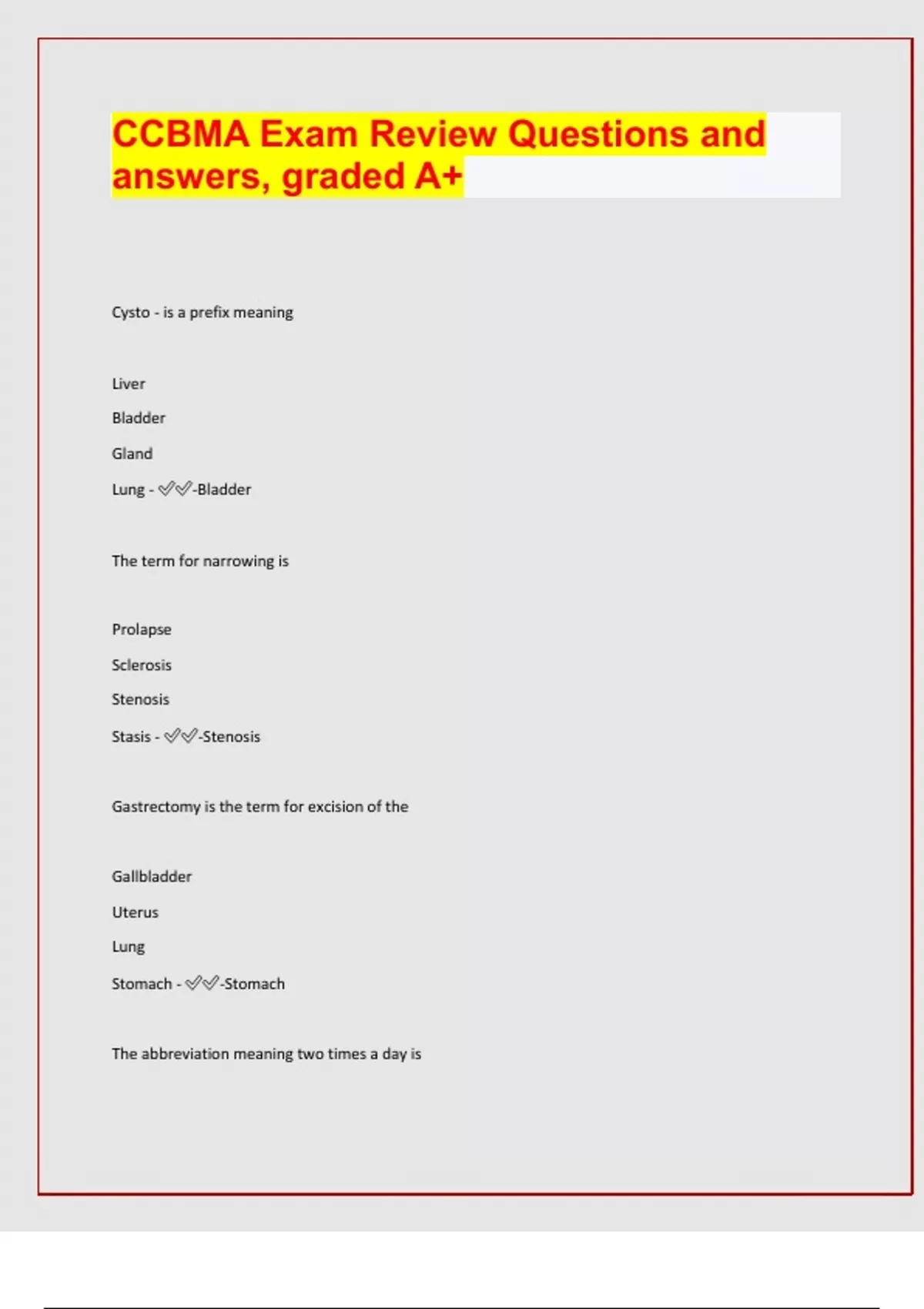 CCBMA Exam Review Questions and answers, graded A+ Cysto - is a prefix meaning Liver Bladder Gland Lung - -Bladder The term for narrowing is Prolapse Sclerosis Stenosis Stasis - -Stenosis Gastrectomy is the term for excision of the Gallbladder Uterus Lung Stomach - -Stomach The abbreviation meaning two times a day is TID QID BID Q2H - -BID Indicate the correctly spelled word Vaxene Vaxceen Vaccine Vakseen - -Vaccine Enlargement of the kidney is called Nephrolysis Nephropexy Nephromegaly Nephrolithiasis - -Nephromegaly Communication with a patient can be improved by Using their first name Talking about yourself Providing Privacy Avoiding eye contact - -Providing privac
