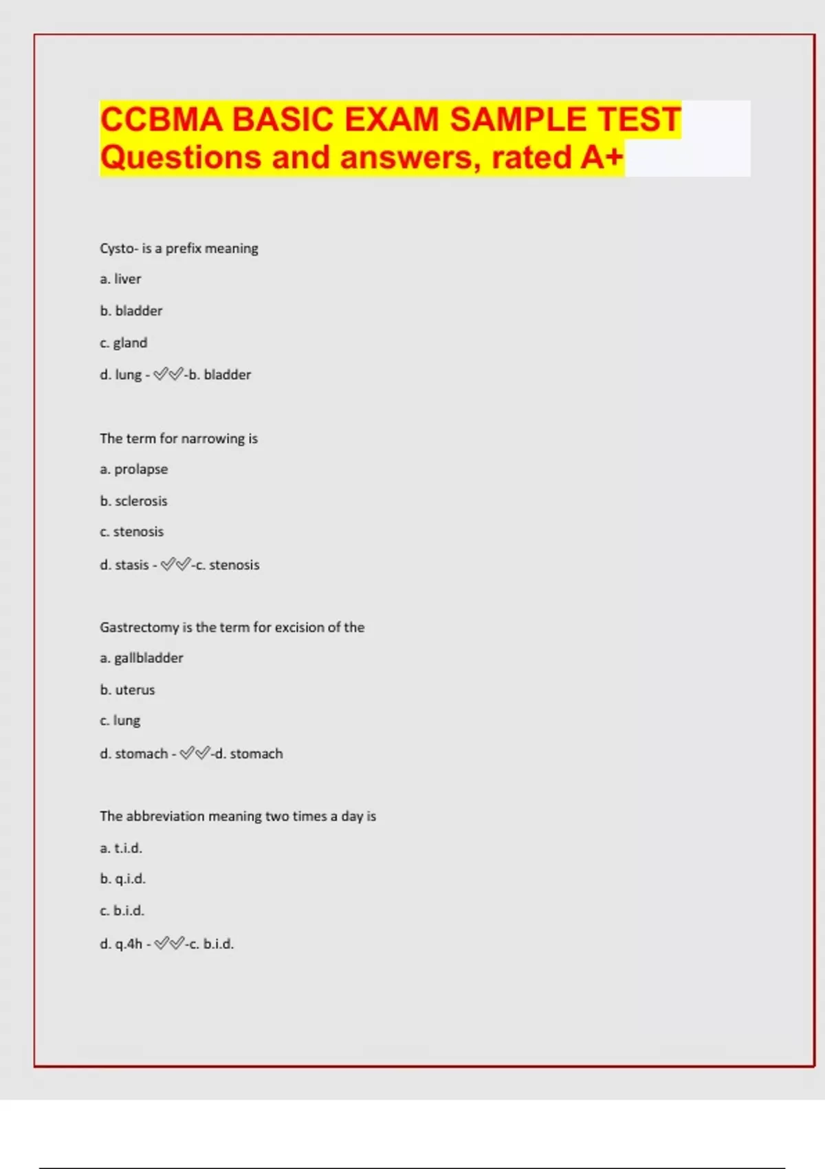 CCBMA BASIC EXAM SAMPLE TEST Questions and answers, rated A+ Cysto- is a prefix meaning a. liver b. bladder c. gland d. lung - -b. bladder The term for narrowing is a. prolapse b. sclerosis c. stenosis d. stasis - -c. stenosis Gastrectomy is the term for excision of the a. gallbladder b. uterus c. lung d. stomach - -d. stomach The abbreviation meaning two times a day is a. t.i.d. b. q.i.d. c. b.i.d. d. q.4h - -c. b.i.d. Indicate the correctly spelled word a. pharengytis b. pharengitis c. pharyngytis d. pharyngitis - -d. pharyngitis Communication with patients can be improved by a. using their first name b. talking about yourself c. providing privacy d. avoiding eye contact - -c. providing privacy A trained Medical Assistant is able to a. function as a nurse b. interpret lab results c. administer IV therapy d. assist with minor surgery - -d. assist with minor surgery A patient's photo was made public without her permission. This is called a. invasion of privacy b. defamation c. fraud d. slander - -a. invasion of privacy Patient instruction sheets are used to
