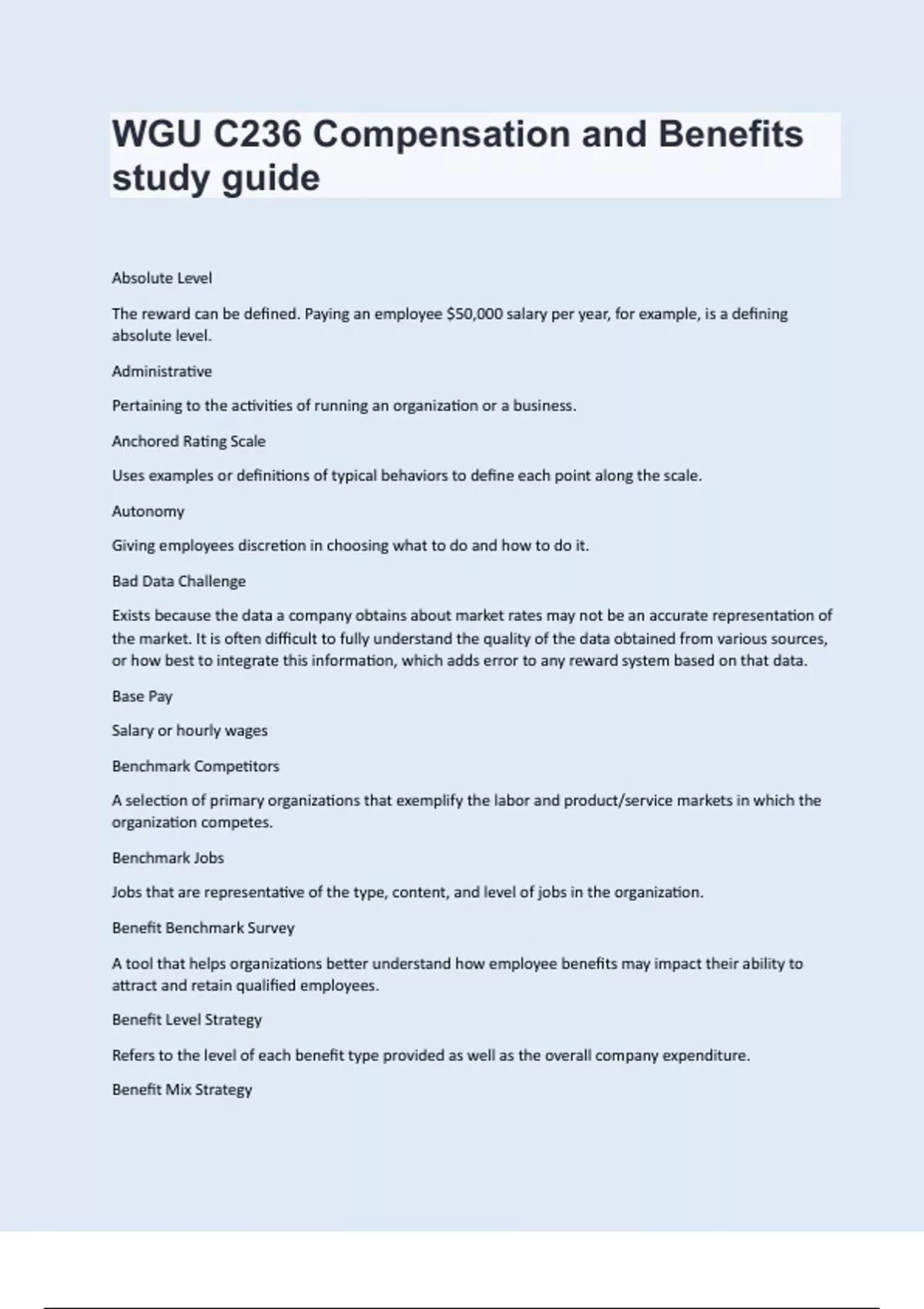 Absolute Level The reward can be defined. Paying an employee $50,000 salary per year, for example, is a defining absolute level. Administrative Pertaining to the activities of running an organization or a business. Anchored Rating Scale Uses examples or definitions of typical behaviors to define each point along the scale. Autonomy Giving employees discretion in choosing what to do and how to do it. Bad Data Challenge Exists because the data a company obtains about market rates may not be an accurate representation of the market. It is often difficult to fully understand the quality of the data obtained from various sources, or how best to integrate this information, which adds error to any reward system based on that data. Base Pay Salary or hourly wages Benchmark Competitors A selection of primary organizations that exemplify the labor and product/service markets in which the organization competes. Benchmark Jobs Jobs that are representative of the type, content, and level of jobs in the organization. Benefit Benchmark Survey A tool that helps organizations better understand how employee benefits may impact their ability to attract and retain qualified employees. Benefit Level Strategy Refers to the level of each benefit type provided as well as the overall company expenditure. Benefit Mix Strategy Refers to the particular combination of benefit types that an organization offers. Broad Input Help, advice and thoughts from employees of all levels of the organization. Broadbanding Entails the use of a few broad bands (or grades) to organize work for pay purposes. Business Strategy The collection of decisions, approaches, and activities that allow an organization to compete and win Business Strategy Support Supporting a business' approach to adapting to changes in its environment in order to compete and win. Capability-based Pay When a reward system explicitly attempts to vary rewards based upon capabilities of the employees. Types include Skill-based pay, Competency-based pay, and Seniority-based pay. Cash Compensation Monetary pay that employees receive in exchange for their work Central Tendency Describes what's typical for a set of data, usually measured by the arithmetic mean, median, or mode. Centralized Approach The Human Resources department makes all decisions relating to pay strategy, as well as specific reward decisions. Centralized Global Rewards Strategy Organizations attempt to have a single set of policies that are determined by the organization and utilized at all locations. Child Labor Defines the type of work appropriate for children and the ages at which children can work. Co-pay Policy A policy that requires employees to pay a set amount for each time any service is used. Collaborative Environment Teams of employees work in concert to be creative, solve problems, and produce results. Commission-based Commission-based reward systems are most often used for jobs with a sales component and provide employees a set percentage of the sales that they make. They are used to provide a strong incentive to create sales and also to maximize the size of those sales. In a pure Commission system, the full risk of low performance is borne by the employees. For this reason many organizations pair a commission-based system with some other form of base pay (such as salary) to more evenly distribute that risk. Communication Strategy A plan for creating, sharing, and receiving information relating to its Total Rewards Systems. Compa-ratio A ratio frequently used to measure the conformity of pay rates to the pay plan. Compensable Factor Job elements or criteria that identify what the organization values for purposes of job evaluation. Identifying compensable factors is step one in the Point factor Approach. Compensatory Time Paid time off instead of overtime pay. Competencies Configurations of knowledge, skills, and traits that enable employee performance. Computer Programming, network administration Consolidate Information Into Job Description Draft Review the information gathered from the interviews to create the draft of the job description. This draft should note any points of uncertainty or disagreement among information sources. Consolidated Omnibus Budget Reconciliation Act (COBRA) An Act which established that employees have a right to continue their employer-sponsored health care plan, at the employees' expense, for up to 18 months. Control Costs Without a variable pay component, labor costs remain the same even when revenues, sales, or profits drop. Performance-based pay helps ensure that when performance is low, the company's cost structure is also reduced. Correcting Mechanism In place to fix any mistake made by the system. Cost Leadership Strategy Focusing business priorities on providing a lower-cost product or service Cost of Living Adjustment (COLA) A periodic salary or wage increase to compensate for inflation. Cost-sharing An approach in which the insurance only pays for a portion of medical expenses. Creative Professionals People who are employed for the extraction of their skills concerning creativity. Critical Success Factors