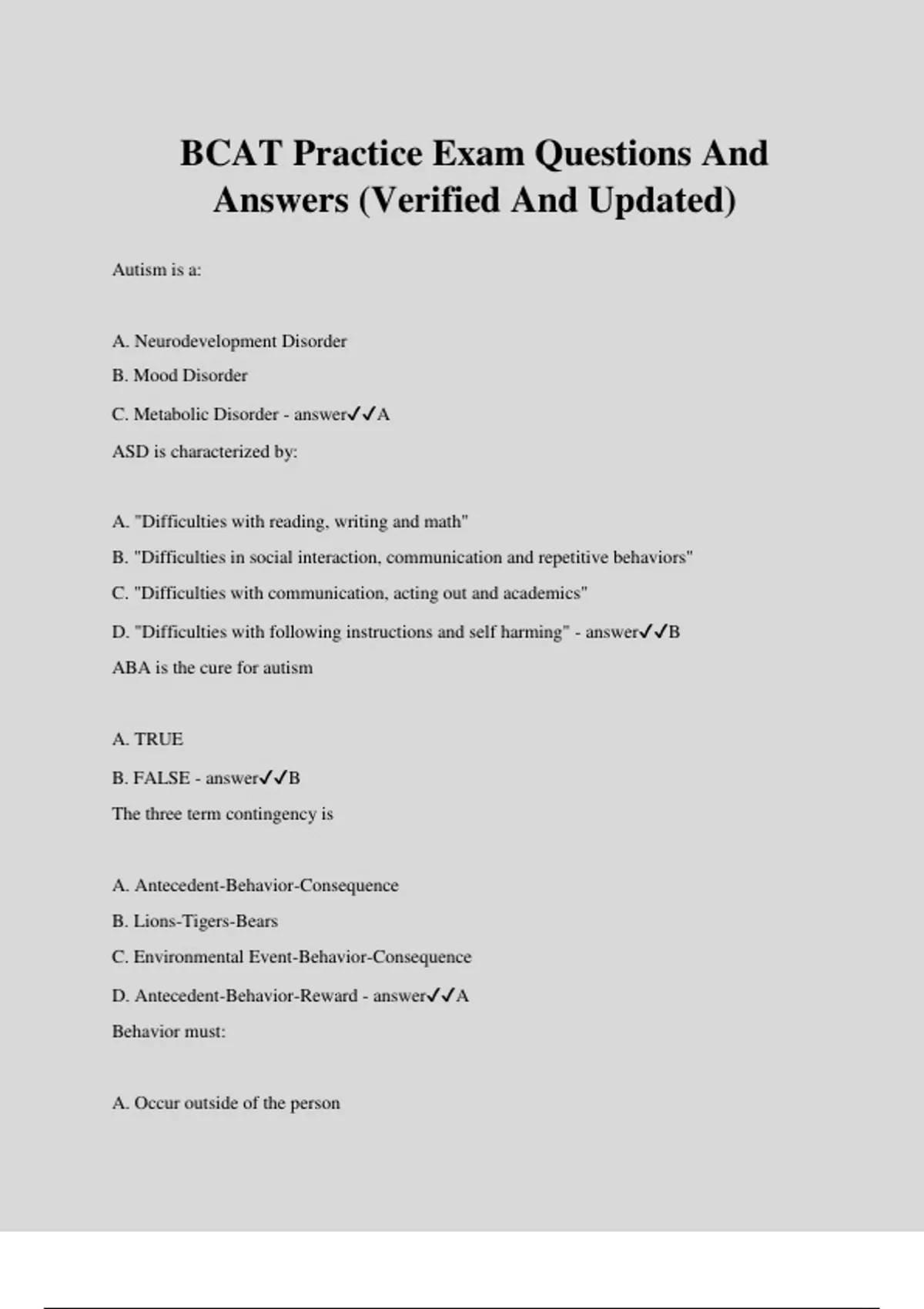 BCAT Practice Exam Questions And Answers (Verified And Updated) Autism is a: A. Neurodevelopment Disorder B. Mood Disorder C. Metabolic Disorder - answerA ASD is characterized by: A. "Difficulties with reading, writing and math" B. "Difficulties in social interaction, communication and repetitive behaviors" C. "Difficulties with communication, acting out and academics" D. "Difficulties with following instructions and self harming" - answerB ABA is the cure for autism A. TRUE B. FALSE - answerB The three term contingency is A. Antecedent-Behavior-Consequence B. Lions-Tigers-Bears C. Environmental Event-Behavior-Consequence D. Antecedent-Behavior-Reward - answerA Behavior must: A. Occur outside of the person B. Be observable by another person C. Be defined as good or bad D. A and B - answerD We seek to understand how ________ influence the occurrence of behavior A. Everything B. Private Events C. Environmental events D. Rewards - answerC Which is not an area we would work on with our clients? A. Hitting classmates B. Communication C. Feeling Angry D. Difficulties with social interaction - answerC Frequency is: A. The length of time it takes to START a behavior after the instruction is given B. Assigning numbers to different prompt levels C. The number of times the behavior occurs D. The length of time that a behavior occurs - answerC ABC Data A. "Records the antecedent, behavior and consequence of problem behaviors" B. Is when target behaviors occur C. The length of time a behavior occurs D. The ratio of number of times a behavior occurs per unit of time - answerA Whole-Interval Time Sampling A. "Records the antecedent, behavior and consequence of problem behaviors" B. The target behavior is recorded as a (+) if occurs throughout the entire interval C. The length of time a behavior occurs D. The length of time it takes to START a behavior - answerB Rate A. The behavior is recorded as a (+) if occurs at least once at any point during the interval B. The number of times the behavior occurs C. Assigns numbers to different prompt levels D. The ratio of number of times a behavior occurs per unit of time - answerD Percent A. Count of Behavior/number of opportunities X 100 B. The ratio of number of times a behavior occurs per unit of time C. The number of times the behavior occurs D. The length of time that a behavior occurs - answerA Scatterplot A. The length of time a behavior occurs B. The number of times the behavior occurs C. When the target behavior occurs D. The behavior is recorded as a (+) if occurs at least once at any point during the interval - answerC Duration A. The ratio of number of times a behavior occurs per unit of time B. The length of time it takes to START a behavior after the instruction is given" C. The number of times the behavior occurs D. The length of time a behavior occurs - answerD Prompt Lev
