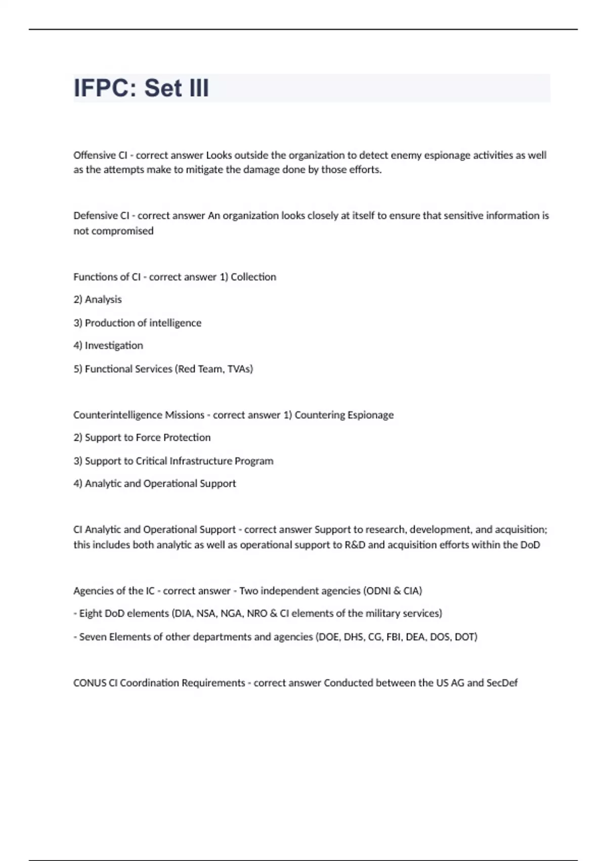 IFPC Set III PRACTICE EXAM QUESTIONS 2024. Offensive CI - correct answer Looks outside the organization to detect enemy espionage activities as well as the attempts make to mitigate the damage done by those efforts. Defensive CI - correct answer An organization looks closely at itself to ensure that sensitive information is not compromised Functions of CI - correct answer 1) Collection 2) Analysis 3) Production of intelligence 4) Investigation 5) Functional Services (Red Team, TVAs) Counterintelligence Missions - correct answer 1) Countering Espionage 2) Support to Force Protection 3) Support to Critical Infrastructure Program 4) Analytic and Operational Support CI Analytic and Operational Support - correct answer Support to research, development, and acquisition; this includes both analytic as well as operational support to R&D and acquisition efforts within the DoD Agencies of the IC - correct answer - Two independent agencies (ODNI & CIA) - Eight DoD elements (DIA, NSA, NGA, NRO & CI elements of the military services) - Seven Elements of other departments and agencies (DOE, DHS, CG, FBI, DEA, DOS, DOT) CONUS CI Coordination Requirements - correct answer Conducted between the US AG and SecDef IC Directive DoD 5240.02 - correct answer Coordinates CI activities conducted OCUNUS in memorandum Annex III between CIA and DoD Counter Intelligence Coordinating Authority (CICA) Tasks - correct answer - Ensure CI functions, activities are incorporated into collection management planning, especially force protection planning - Advises component CI organizations, coordinates with the Joint CI division and other CCMD CICAs for national-level joint CI assistance