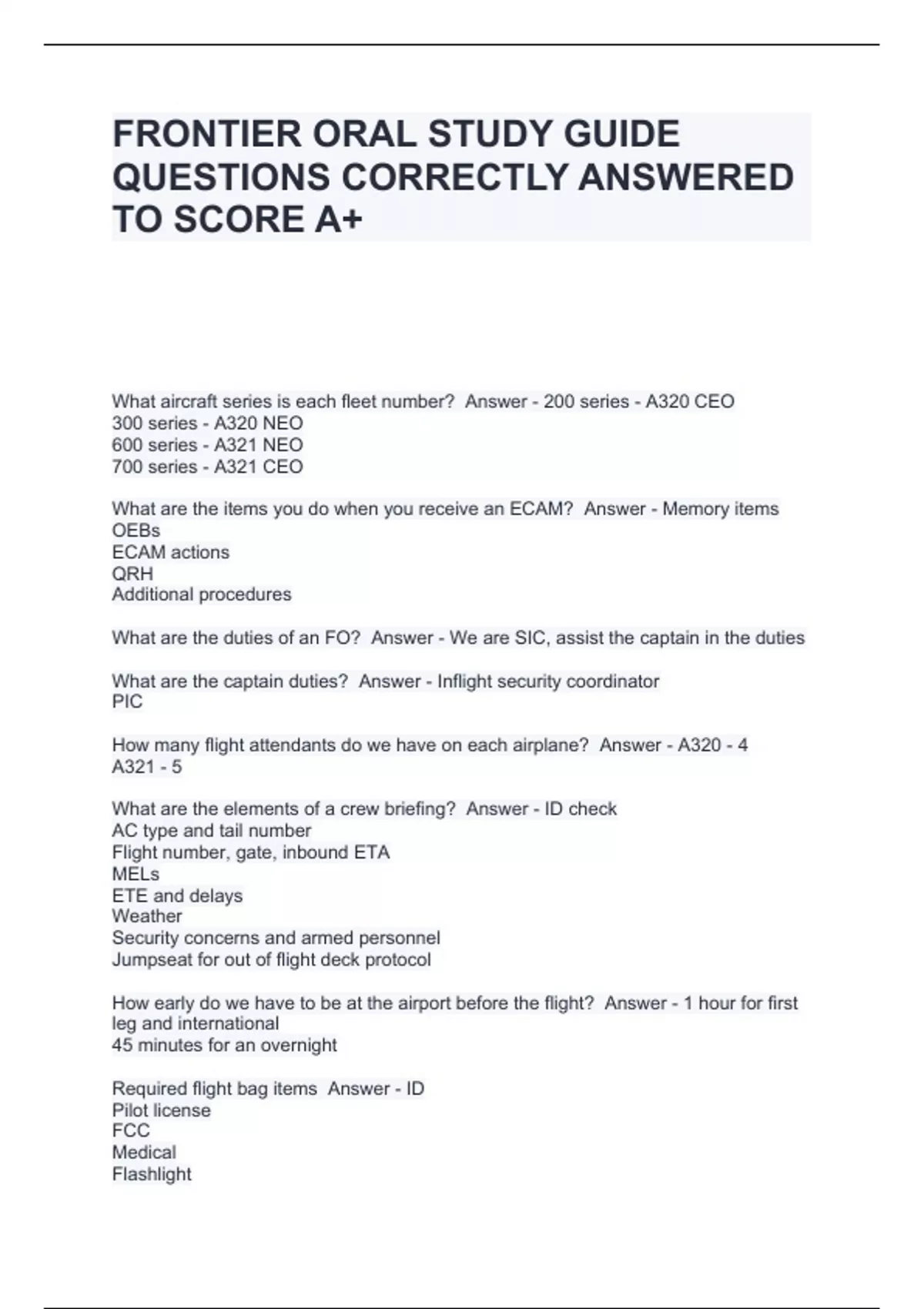 FRONTIER ORAL STUDY GUIDE QUESTIONS CORRECTLY ANSWERED TO SCORE A+