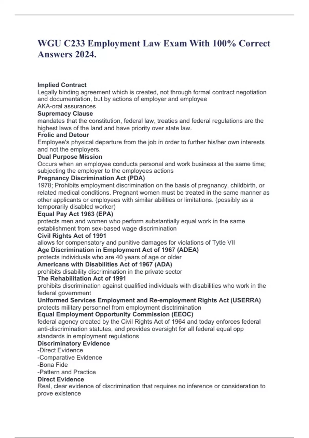 WGU C233 Employment Law Exam With 100% Correct Answers 2024. Implied Contract Legally binding agreement which is created, not through formal contract negotiation and documentation, but by actions of employer and employee AKA-oral assurances Supremacy Clause mandates that the constitution, federal law, treaties and federal regulations are the highest laws of the land and have priority over state law. Frolic and Detour Employee's physical departure from the job in order to further his/her own interests and not the employers. Dual Purpose Mission Occurs when an employee conducts personal and work business at the same time; subjecting the employer to the employees actions Pregnancy Discrimination Act (PDA) 1978; Prohibits employment discrimination on the basis of pregnancy, childbirth, or related medical conditions. Pregnant women must be treated in the same manner as other applicants or employees with similar abilities or limitations. (possibly as a temporarily disabled worker) Equal Pay Act 1963 (EPA) protects men and women who perform substantially equal work in the same establishment from sex-based wage discrimination Civil Rights Act of 1991 allows for compensatory and punitive damages for violations of Tytle VII Age Discrimination in Employment Act of 1967 (ADEA) protects individuals who are 40 years of age or older Americans with Disabilities Act of 1967 (ADA) prohibits disability discrimination in the private sector The Rehabilitation Act of 1991 prohibits discrimination against qualified individuals with disabilities who work in the federal government Uniformed Services Employment and Re-employment Rights Act (USERRA) protects military personnel from employment disctrimination Equal Employment Opportunity Commission (EEOC) federal agency created by the Civil Rights Act of 1964 and today enforces federal anti-discrimination statutes, and provides oversight for all federal equal opp standards in employment regulations Discriminatory Evidence -Direct Evidence -Comparative Evidence -Bona Fide -Pattern and Practice Direct Evidence Real, clear evidence of discrimination that requires no inference or consideration to prove existence