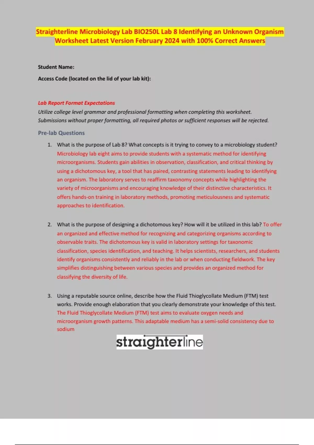 Straighterline Microbiology Lab BIO250L Lab 8 Identifying an Unknown Organism Worksheet Latest Version February 2024 with 100% Correct Answers