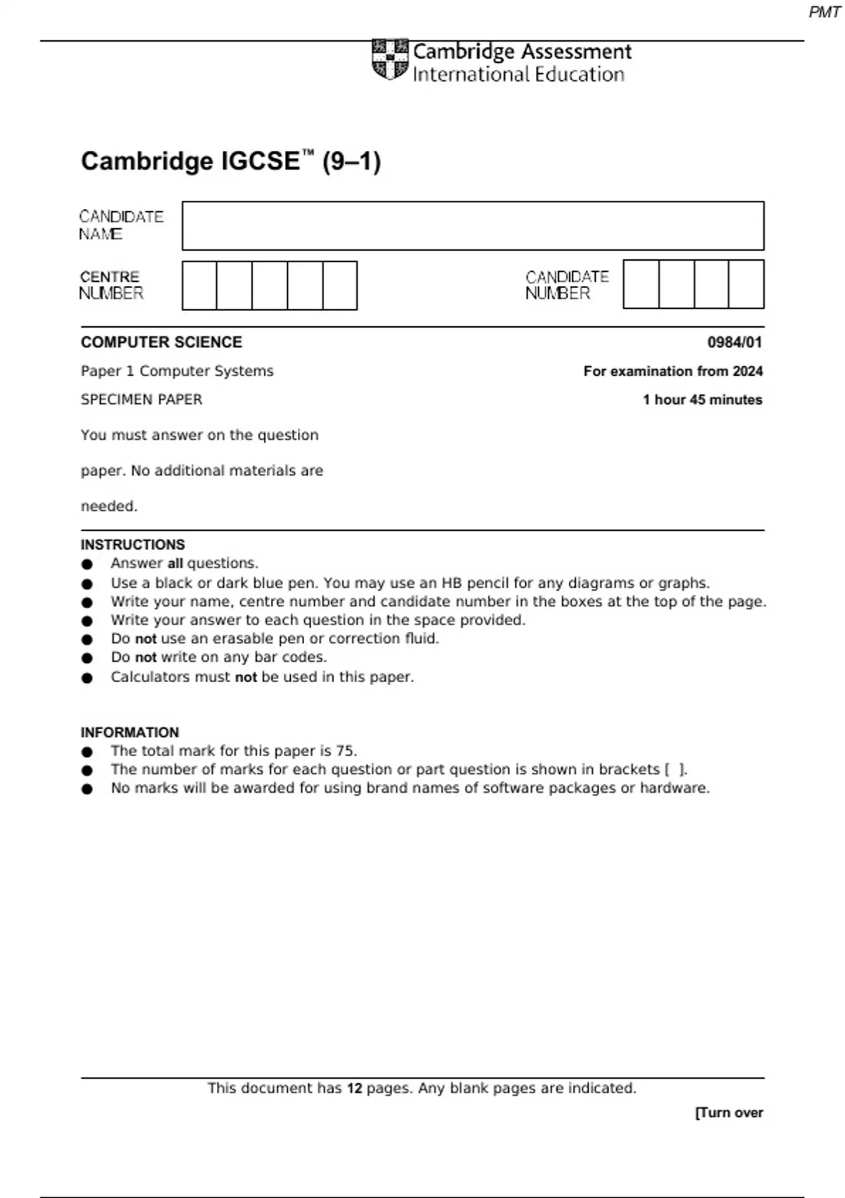 Cambridge IGCSE™ (9–1) COMPUTER SCIENCE 0984/01 Paper 1 Computer Systems For examination from 2024 SPECIMEN PAPER 1 hour 45 minutes You must answer on the question paper. No additional materials are needed. INSTRUCTIONS ● Answer all questions. ● Use a black or dark blue pen. You may use an HB pencil for any diagrams or graphs. ● Write your name, centre number and candidate number in the boxes at the top of the page. ● Write your answer to each question in the space provided. ● Do not use an erasable pen or correction fluid. ● Do not write on any bar codes. ● Calculators must not be used in this paper. INFORMATION ● The total mark for this paper is 75. ● The number of marks for each question or part question is shown in brackets [ ]. ● No marks will be awarded for using brand names of software packages or hardware. This document has 12 pages. Any blank pages are indicated. 1 A school network has several computers. Each computer in the network has a media access control (MAC) address. Hexadecimal is used for MAC addresses. Part of a MAC address is given. 97–5C–E1 Each pair of digits is stored as binary in an 8-bit register. (a) Complete the binary register for these two pairs of digits. 97 5C [4] (b) Describe what is meant by a MAC address. ................................................................................................................................................... ................................................................................................................................................... ................................................................................................................................................... ................................................................................................................................................... ................................................................................................................................................... ................................................................................................................................................... ................................................................................................................................................... . [4] (c) Give two other uses of hexadecimal in computer science. 1 ................................................................................................................................................ 2 [2] (d) Another value is stored as binary in a register. 0 1 0 1 0 0 1 0 (i) A logical left shift of two places is performed on the binary value. Complete the binary register to show its contents after this logical left shift. [1] (ii) State one effect this logical shift has on the binary value. ........................................................................................................................................... . [1] (e) Negative denary numbers can also be represented as binary using two’s complement. Complete the binary register for the denary value −54. You must show all your working. Working space ........................................................................................................................... ................................................................................................................................................... ................................................................................................................................................... ................................................................................................................................................... Register: [2]