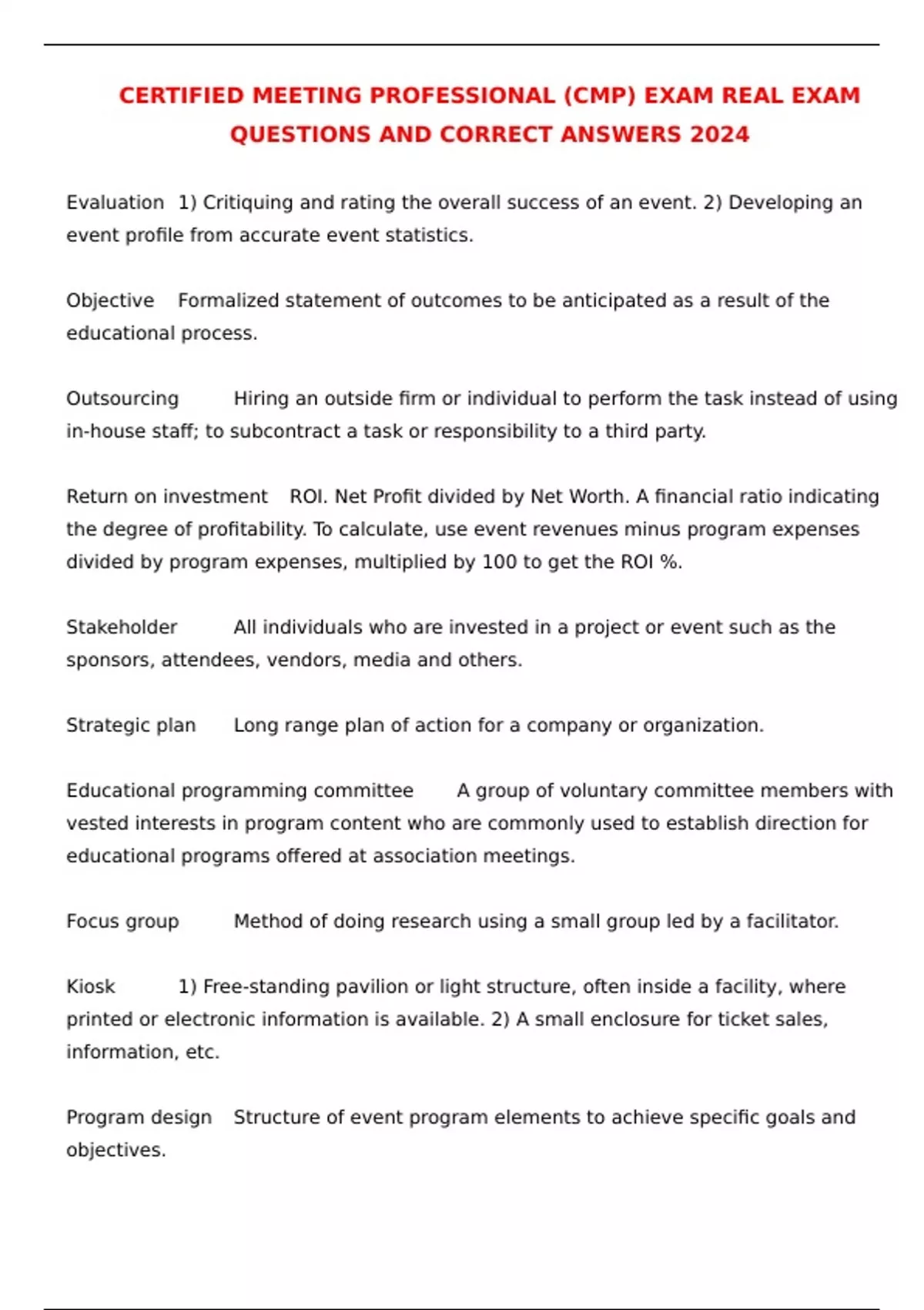 CERTIFIED MEETING PROFESSIONAL (CMP) EXAM REAL EXAM QUESTIONS AND CORRECT ANSWERS 2024 Evaluation 1) Critiquing and rating the overall success of an event. 2) Developing an event profile from accurate event statistics. Objective Formalized statement of outcomes to be anticipated as a result of the educational process. Outsourcing Hiring an outside firm or individual to perform the task instead of using in-house staff; to subcontract a task or responsibility to a third party. Return on investment ROI. Net Profit divided by Net Worth. A financial ratio indicating the degree of profitability. To calculate, use event revenues minus program expenses divided by program expenses, multiplied by 100 to get the ROI %. Stakeholder All individuals who are invested in a project or event such as the sponsors, attendees, vendors, media and others. Strategic plan Long range plan of action for a company or organization. Educational programming committee A group of voluntary committee members with vested interests in program content who are commonly used to establish direction for educational programs offered at association meetings. Focus group Method of doing research using a small group led by a facilitator. Kiosk 1) Free-standing pavilion or light structure, often inside a facility, where printed or electronic information is available. 2) A small enclosure for ticket sales, information, etc. Program design Structure of event program elements to achieve specific goals and objectives. Sampling 1) A research method based upon selecting a portion of a population for study. 2) Paperwork and fees paid to a building by exhibitors for the right to serve food product. Survey Solicitation of opinions regarding services; questionnaire. Audience reaction team 4 or 5 participants query the main speaker from the stage with questions from the audience and follow up questions. Buzz session Method to increase audience participation by dividing all participants in discussion groups each of which reports the group's findings and opinions during a following plenary session. Certified Speaking Professional (CSP) CSP. Accredited designation offered by the National Speakers Association. This designation is earned for extensive, documented speaking experience and client satisfaction. Colloquium An informal meeting for the purpose of discussion; usually of an academic or research nature and in order to ascertain areas of mutual interest through exchange of ideas. Conducted as and when convenient, but with little regularity. Debate A discussion which takes place within a meeting, a public or private sitting or in one of the various types of assembly or meeting. Facilitator An individual who guides discussion and/or decision making. Fishbowl An interchange between an inner circle debating an issue and an outer circle of observers. Individuals occasionally move from one circle to the other. Interview The presenter is questioned by a moderator on behalf of the audience. National Speakers Association (NSA) National Speakers Association. A member of the Convention Industry Council.