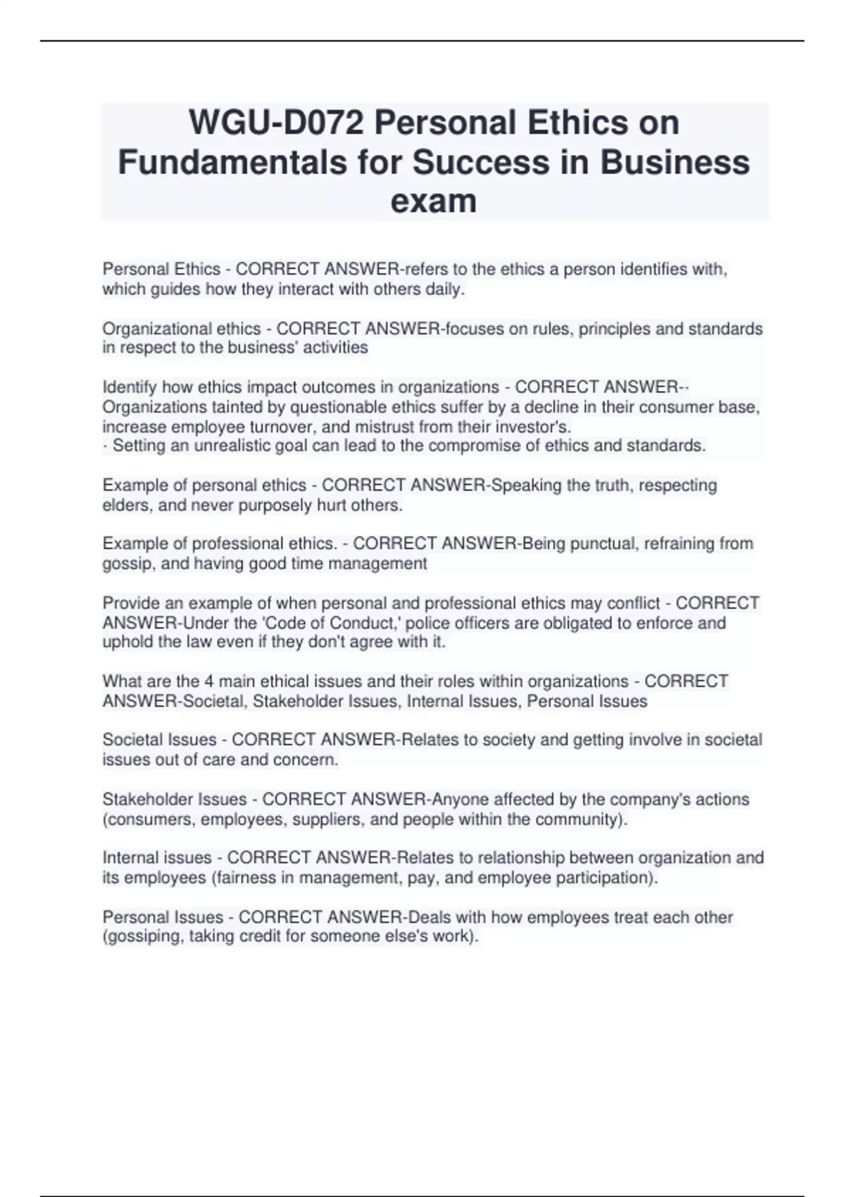 WGU-D072 Personal Ethics on Fundamentals for Success in Business exam Personal Ethics - CORRECT ANSWER-refers to the ethics a person identifies with, which guides how they interact with others daily. Organizational ethics - CORRECT ANSWER-focuses on rules, principles and standards in respect to the business' activities Identify how ethics impact outcomes in organizations - CORRECT ANSWER-· Organizations tainted by questionable ethics suffer by a decline in their consumer base, increase employee turnover, and mistrust from their investor's. · Setting an unrealistic goal can lead to the compromise of ethics and standards. Example of personal ethics - CORRECT ANSWER-Speaking the truth, respecting elders, and never purposely hurt others. Example of professional ethics. - CORRECT ANSWER-Being punctual, refraining from gossip, and having good time management Provide an example of when personal and professional ethics may conflict - CORRECT ANSWER-Under the 'Code of Conduct,' police officers are obligated to enforce and uphold the law even if they don't agree with it. What are the 4 main ethical issues and their roles within organizations - CORRECT ANSWER-Societal, Stakeholder Issues, Internal Issues, Personal Issues Societal Issues - CORRECT ANSWER-Relates to society and getting involve in societal issues out of care and concern. Stakeholder Issues - CORRECT ANSWER-Anyone affected by the company's actions (consumers, employees, suppliers, and people within the community). Internal issues - CORRECT ANSWER-Relates to relationship between organization and its employees (fairness in management, pay, and employee participation). Personal Issues - CORRECT ANSWER-Deals with how employees treat each other (gossiping, taking credit for someone else's work). What are some benefits to an organization that practices high ethics? - CORRECT ANSWER-benefit from the trust of their stakeholders and has a competitive advantage in the marketplace. Define Corporate Social Responsibility (CSR). - CORRECT ANSWER-when an organization voluntarily engages in issues that are affecting the environment, community or society at large. What is the importance of CSR in the